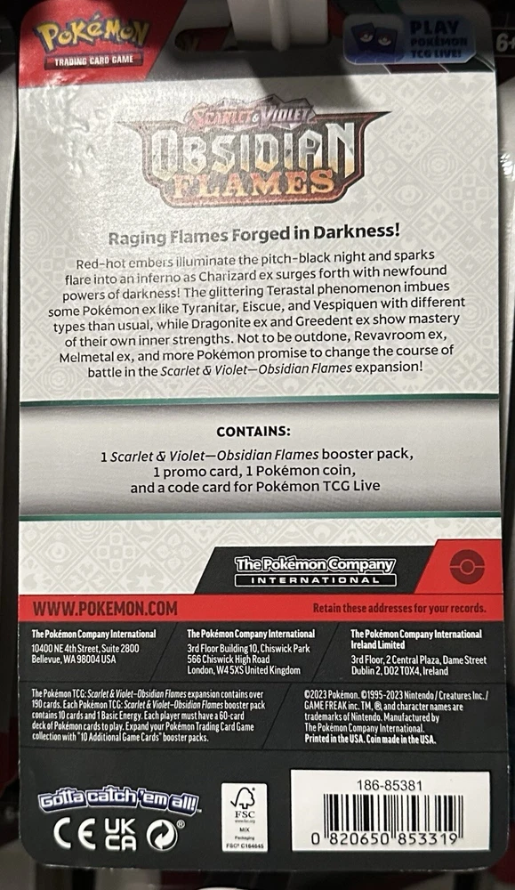 Pokemon TCG Obsidian Flames Booster Pack, promo and Pokemon coin CONTAINS: 1 Scarlet & Violet-Obsidian Flames booster pack, 1 promo card, 1 Pokémon coin, and a code card for Pokémon TCG Live