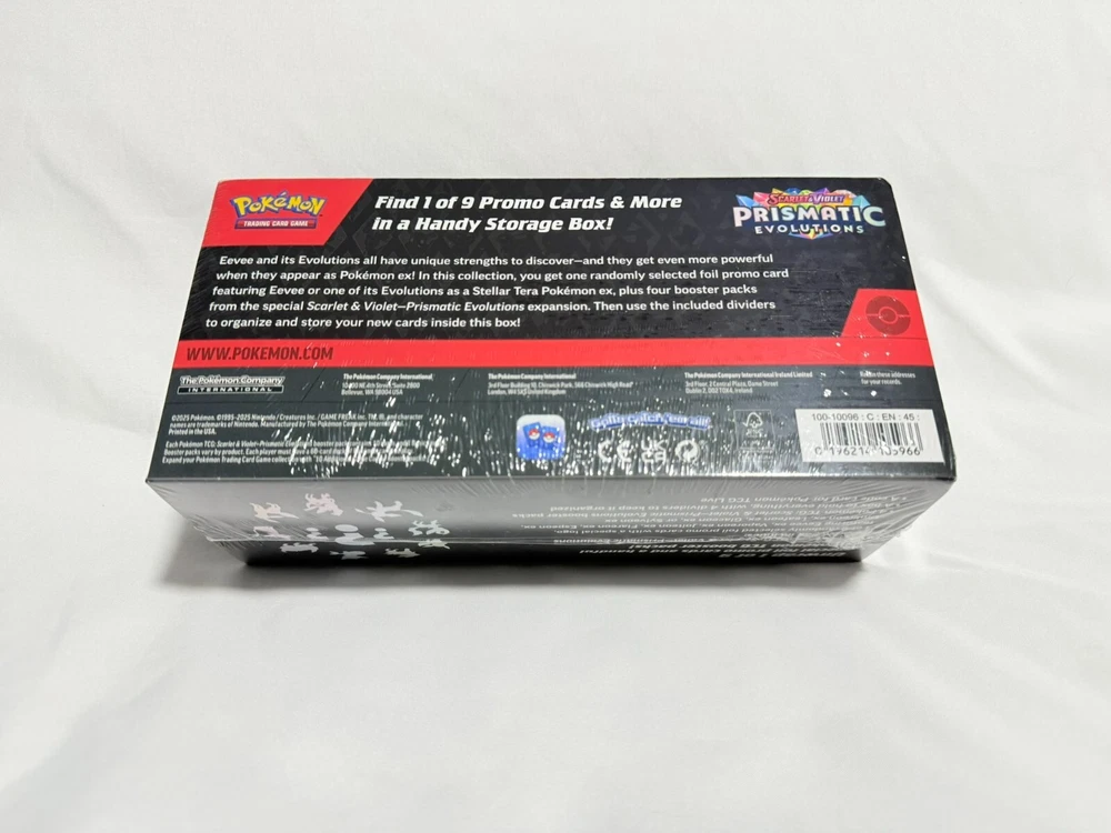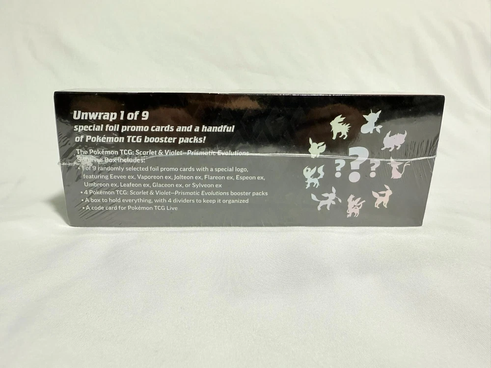 1 promo 4 booster packs 4 dividers Brand new/factory sealed Pokemon TCG: Prismatic Evolutions Surprise Box. The box contains 1 random Evee foil card, 4 booster packs and 4 dividers. Box can be used to organize and store your cards. *Shipping will be USPS Ground Advantage and will ship same day if ordered by 2pm PST on a business day. Feel free to reach out with any questions!