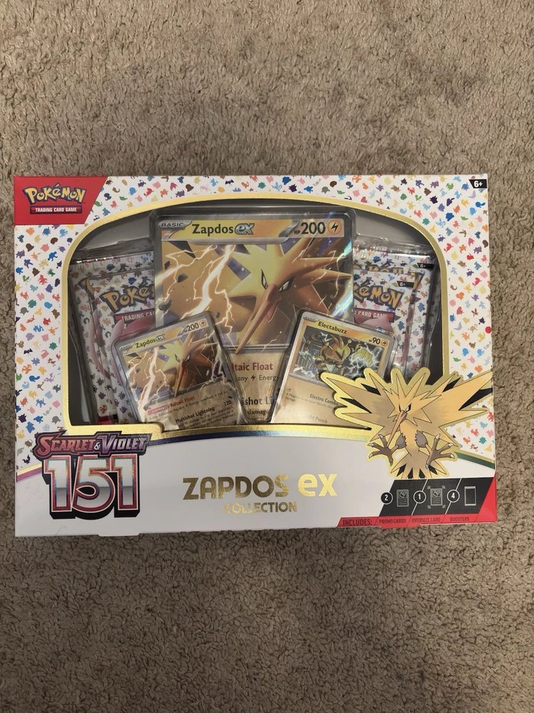 Pokemon TCG: Scarlet & Violet 151 | Zapdos EX Collection Box (SEALED/NEW) Strike with electrifying power and then retreat as fast as lightning with Zapdos ex! This Legendary Pokémon of the Kanto region is here as a ready-to-play promo card and an oversize card for your collection, along with a foil card featuring Electabuzz, and more Pokémon inside booster packs from the special Scarlet & Violet—151 expansion. The Pokémon TCG: Scarlet & Violet—151 Collection—Zapdos ex includes: - 1 foil promo card featuring Zapdos ex - 1 foil card featuring Electabuzz - 1 oversize foil card featuring Zapdos ex - 4 Pokémon TCG: Scarlet & Violet—151 booster packs - A code card for Pokémon TCG Live