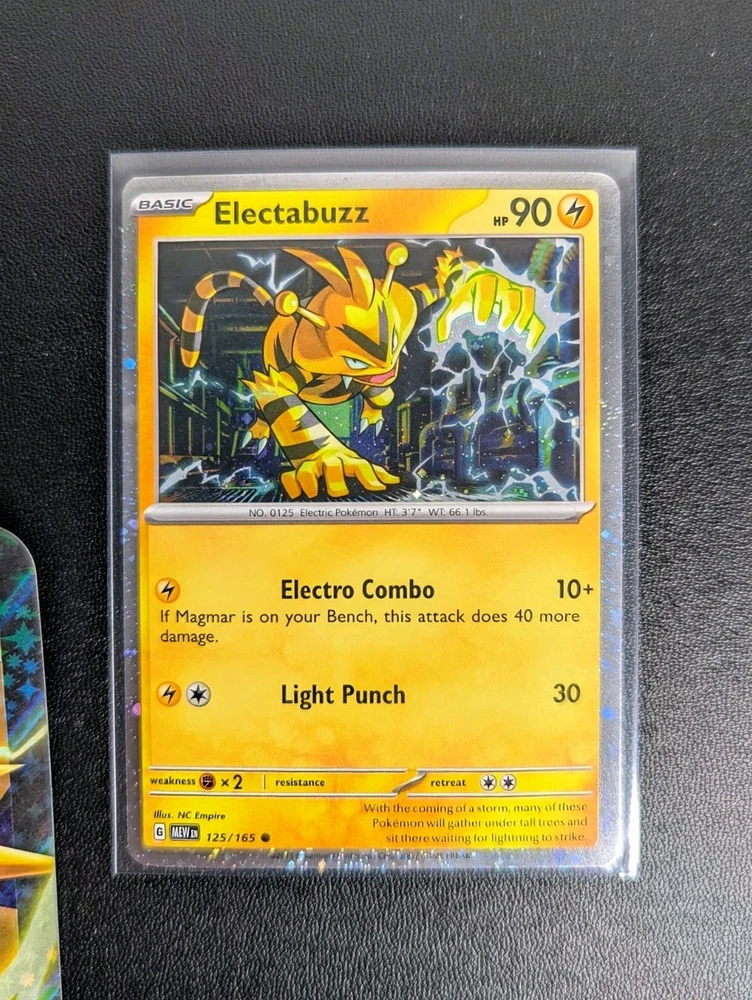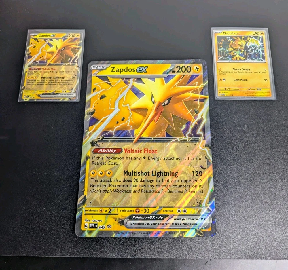 Pokemon TCG: Scarlet & Violet 151 Zapdos EX Box PROMO CARDS w/ Jumbo Card You will receive the cards pictured above. 2 standard size promo cards (ZAPDOS EX + ELECTABUZZ) and 1 JUMBO card (ZAPDOS EX). They are in near mint condition and were sleeved immediately after opening the product box. ---------------------------------------------------------- A stunning set of Pokemon TCG Scarlet & Violet 151 Promo Cards. This set includes Zapdos EX, and Electabuzz, it also includes the jumbo promo card. They feature a beautiful holo finish. These promo cards are a must-have for any serious collector of the Pokemon TCG. Don't miss out on this opportunity to add these rare and speciality cards to your collection! Thanks for looking!