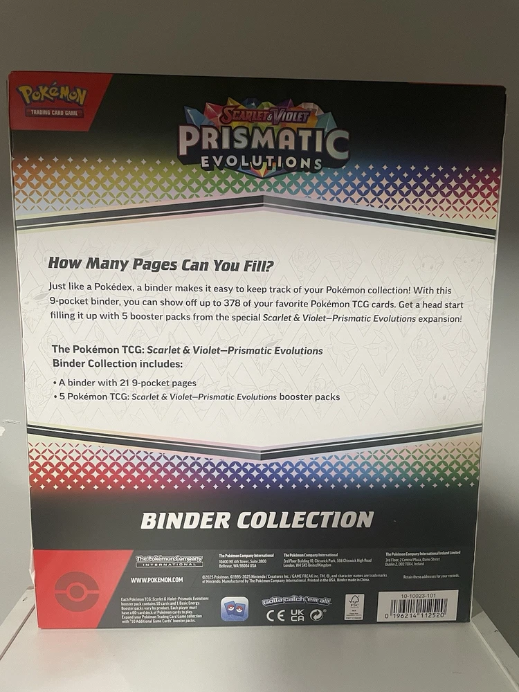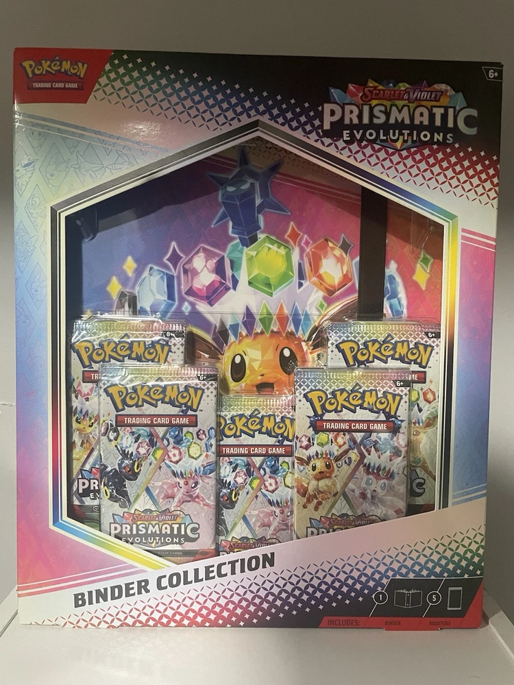 BRAND NEW SEALED. SHIP FAST. Elevate your Pokémon TCG collection with the Scarlet & Violet Prismatic Evolutions Binder Collection. This sealed box features a binder collection of 9 iconic evolutions including Umbreon, Espeon, Flareon, Glaceon, Jolteon, Eevee, Sylveon, Vaporeon, and Leafeon. The cards are in English language and standard size, making them perfect for any collector or player. The Pokémon Company has once again delivered a fantastic set that is sure to impress. This box includes a booster feature that makes it easy to add new cards to your collection. Perfect for anyone aged 6 and up, this Prismatic Evolutions Binder Collection is a must-have for any Pokémon TCG fan.