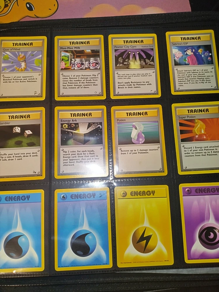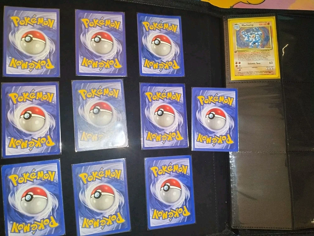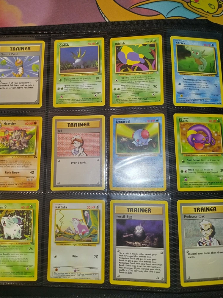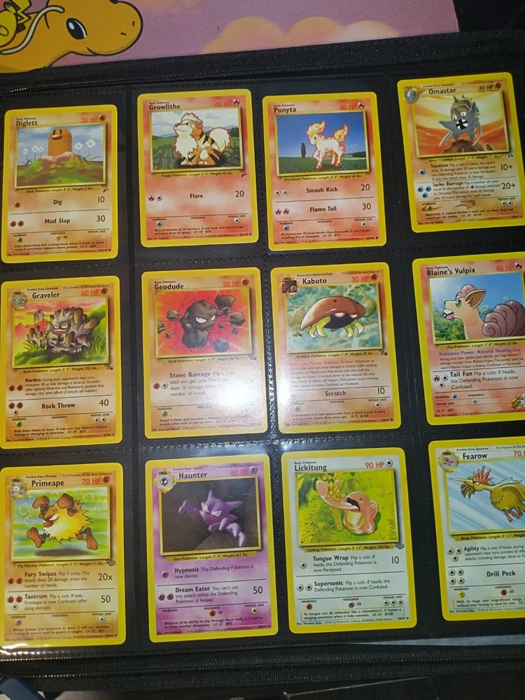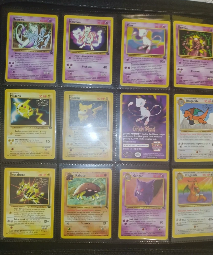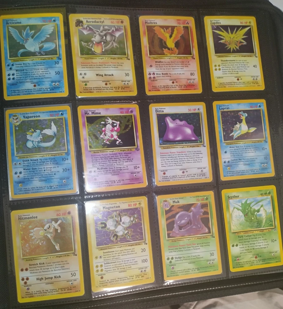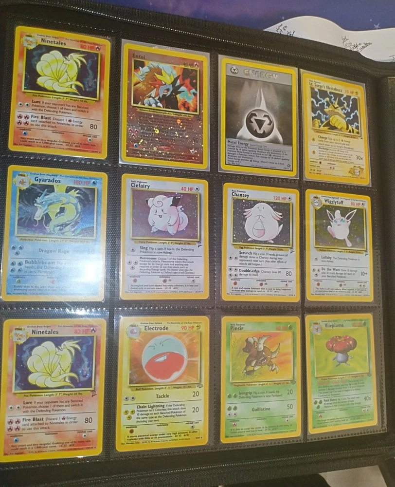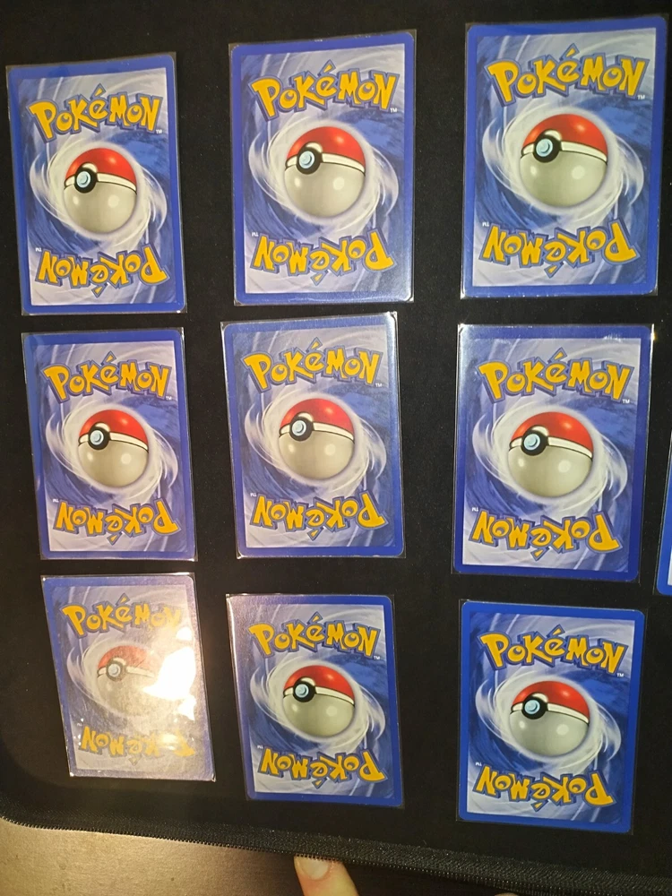 Great deal ! Vaultx 12 pocket navy blue binder included with cards. 34 Holographic cards condition range from LP to Nm 40 first editions condition NM 10 promos condition NM The rest of the cards included are rares, commons,& uncommons condition is Nm Majority of the cards condition is lightly played to near mint. There are very few moderate played cards in the collection over all excellent condition for vintage pokemon cards. Lightly Played to moderate played Holos base set Mewtwo Base set gyrados Base set 2 ninetales Base set Hitmonchan Base set poliwrath Fossil Lapras Legendary Ninetales Lt surges Electabuzz Entei promo First edition Machamp