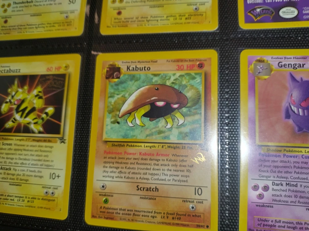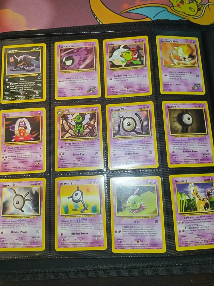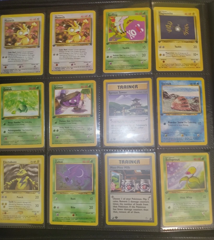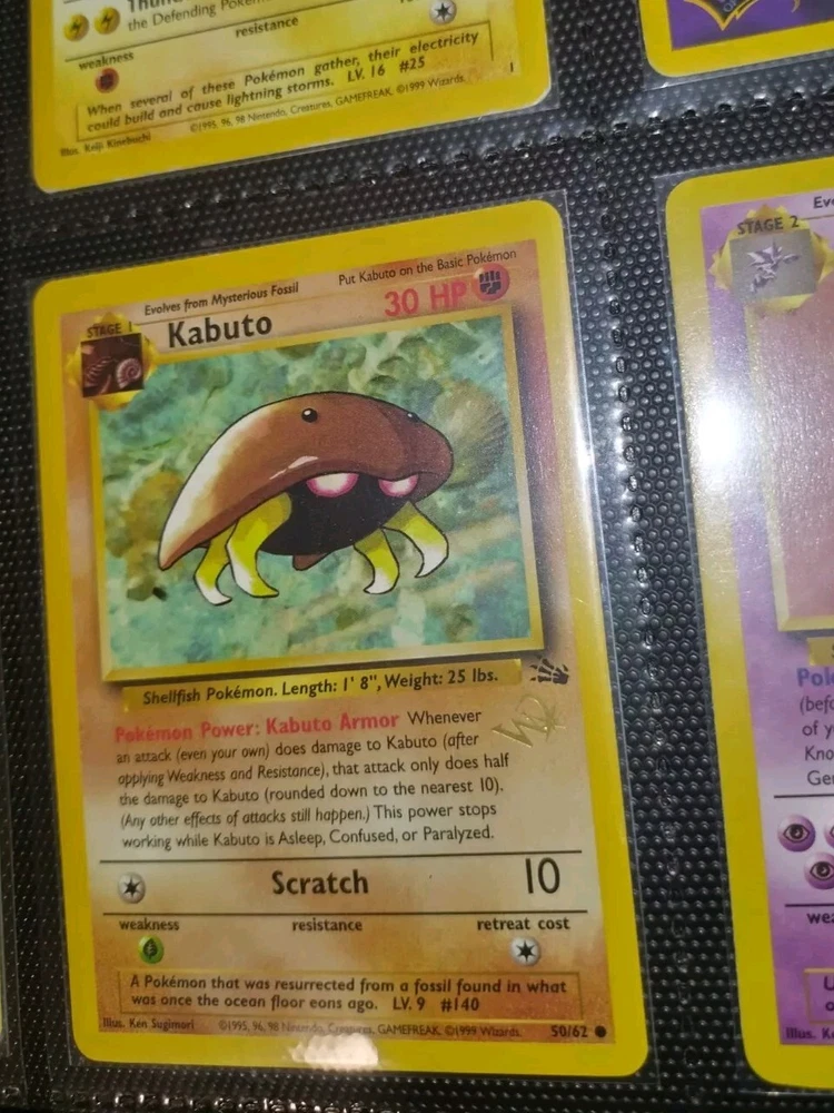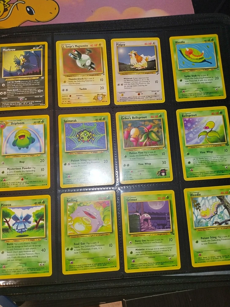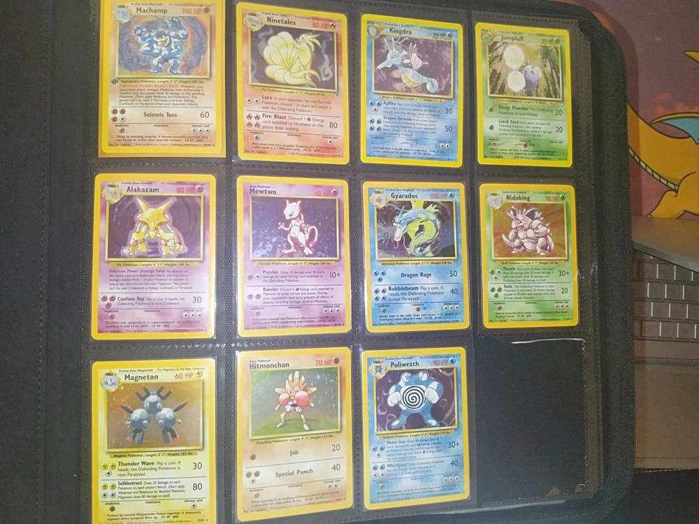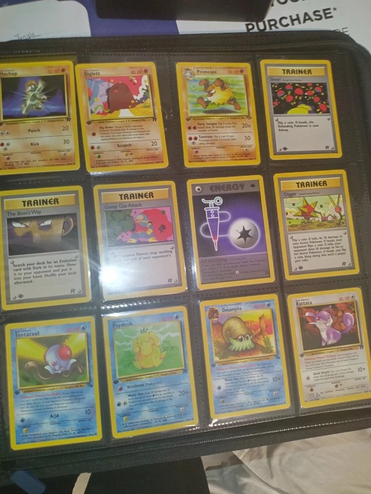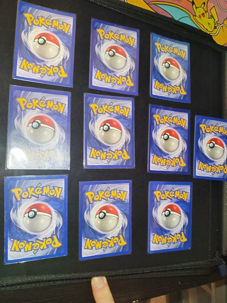 Great deal ! Vaultx 12 pocket navy blue binder included with cards. 34 Holographic cards condition range from LP to Nm 40 first editions condition NM 10 promos condition NM The rest of the cards included are rares, commons,& uncommons condition is Nm Majority of the cards condition is lightly played to near mint. There are very few moderate played cards in the collection over all excellent condition for vintage pokemon cards. Lightly Played to moderate played Holos base set Mewtwo Base set gyrados Base set 2 ninetales Base set Hitmonchan Base set poliwrath Fossil Lapras Legendary Ninetales Lt surges Electabuzz Entei promo First edition Machamp