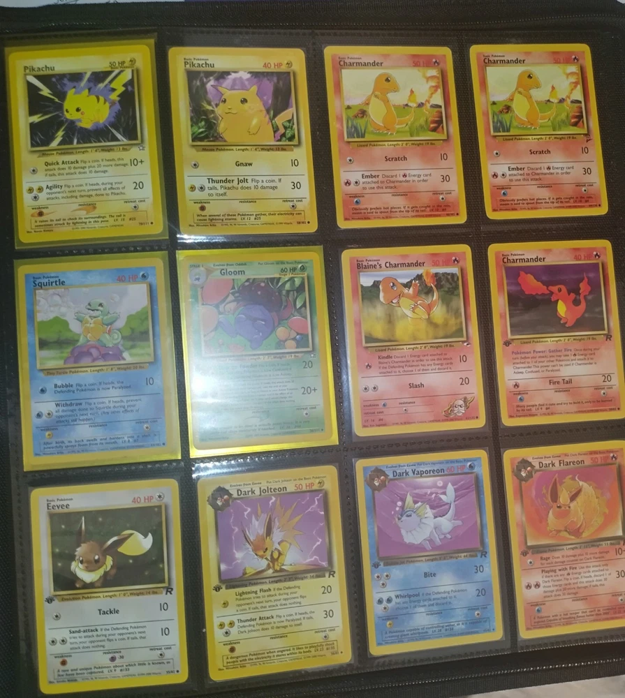 Finish: Foil, Holo, Regular Vintage: Yes Year Manufactured: 1999 Character: Charmander, Eevee, Espeon, Flareon, Pikachu, Vaporeon Manufacturer: Nintendo Set: Base Set, Base Set 2, Fossil, Gym Challenge, Gym Heroes, Jungle, Legendary Collection, Neo Destiny, Neo Discovery, Neo Genesis, Neo Revelation, Team Rocket Card Type: Pokémon Language: English Attribute/MTG:Color: Fire, Grass, Multi-Color, Water Features: Chase, Extended Art, Full Art, Promo, Stamped Card Size: Standard Game: Pokémon TCG Age Level: 4+ Number of Cards: 185