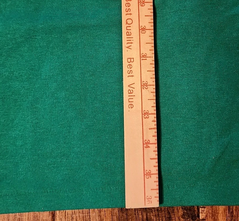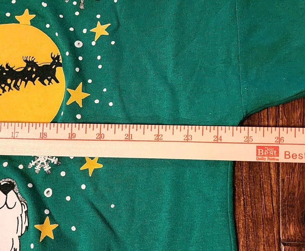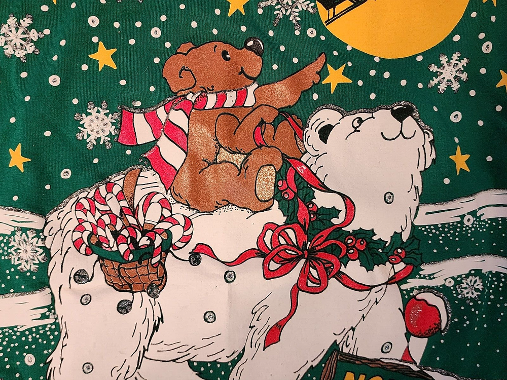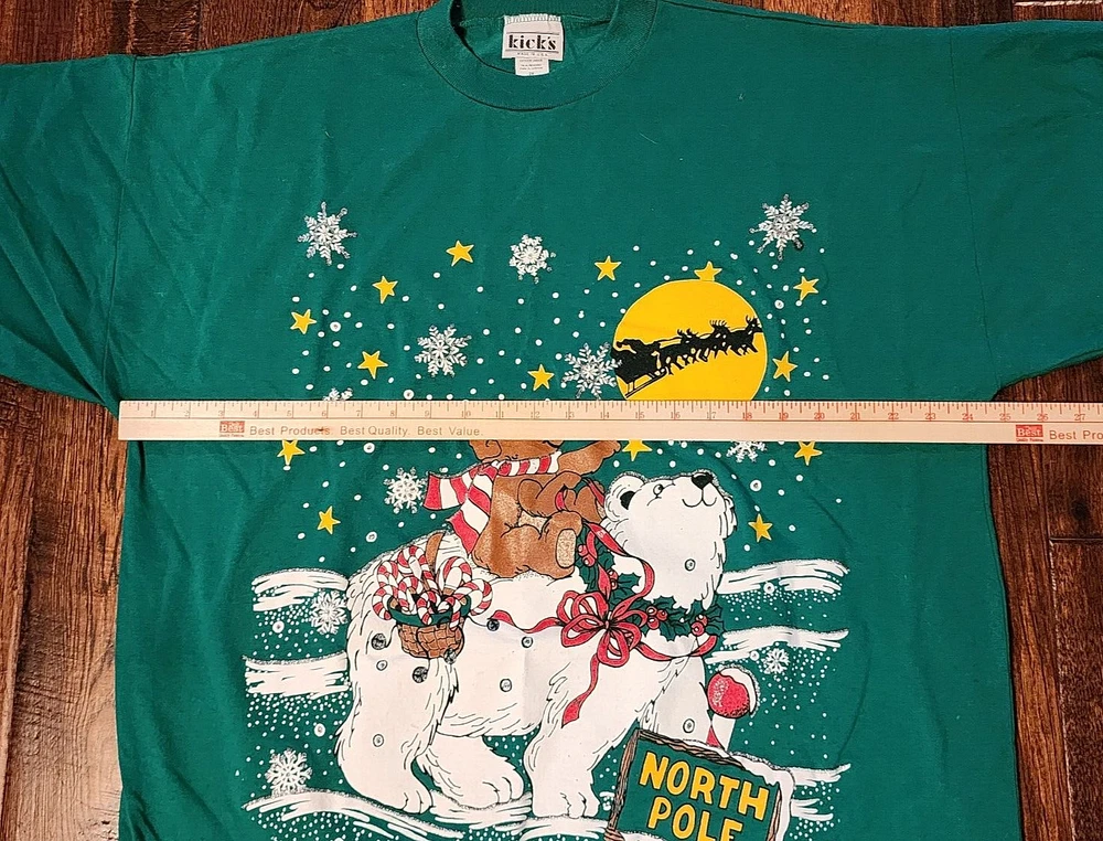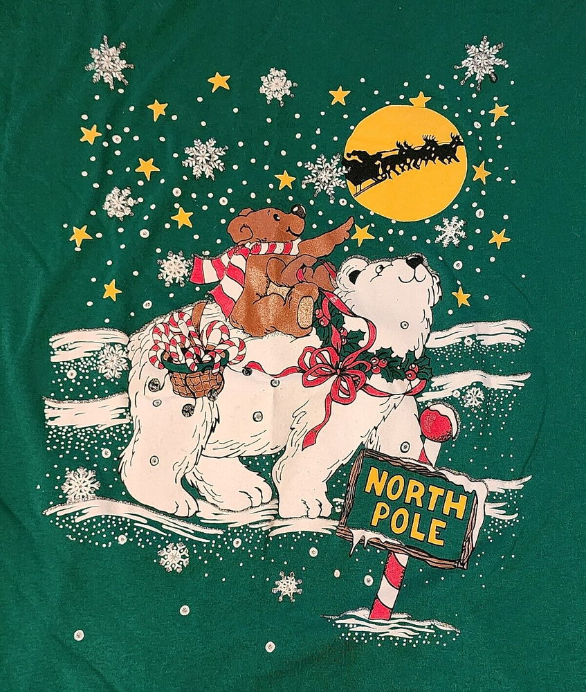 This is an oversized tee with a Christmas theme print on front. It's Christmas green, even tho photos appear blue. It's either a nightgown or tunic, definately longer than a usual t-shirt. The brand is kick's Made in USA, 50% cotton, polyester, made in USA, 2X. The front has a full moon with Santa and sleigh in the sky, a small brown bear riding on a polar bear. The background is snowflakes with silver metallic accents. At the bottom - sign post North Pole. It's feels like its either not been worn/washed, or lightly worn. buyer to pay shipping of $10.00