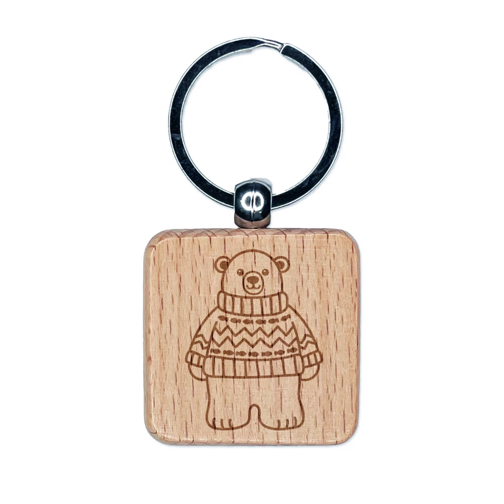 Polar Bear in Sweater Engraved Wood Square Keychain Tag Charm