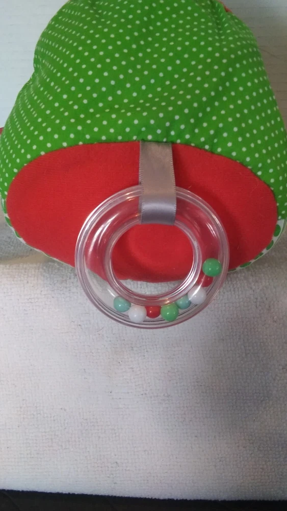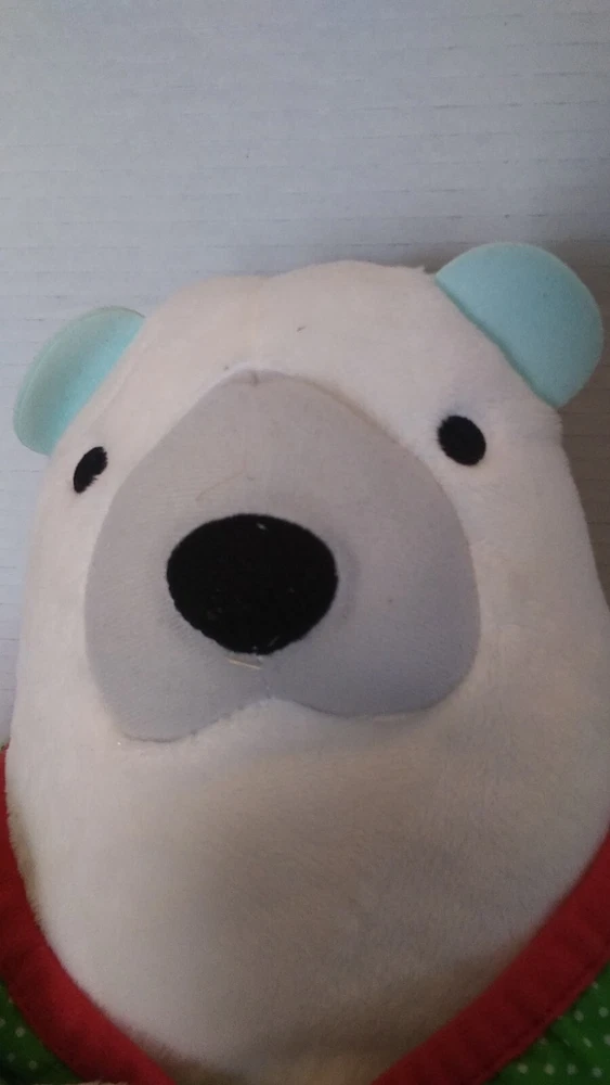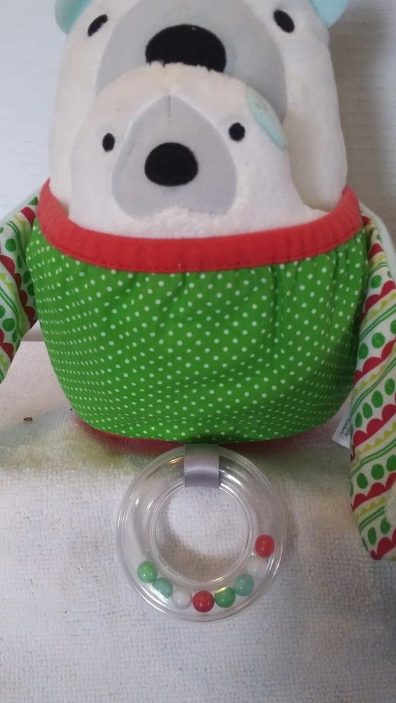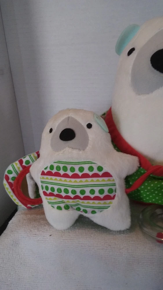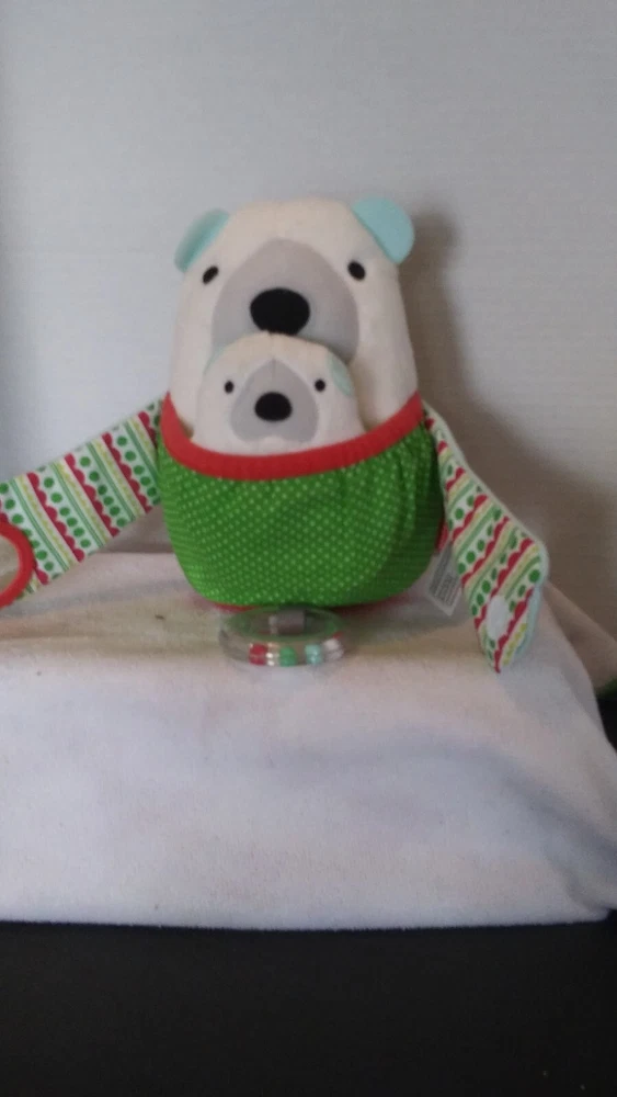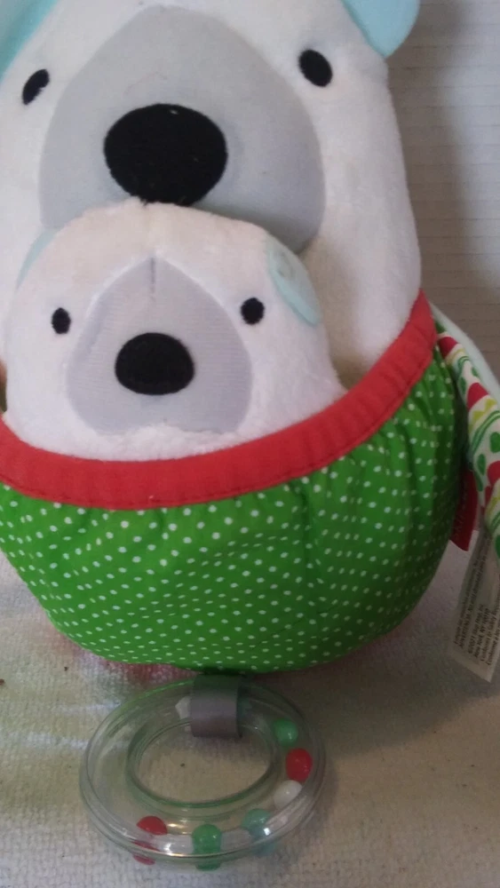 Really cute excellent condition. Has a baby polar bear in front pouch. You could hang this. There is a plastic ring on the bottom and a small mirror on right paw. The baby bear comes out and is very soft. The large bear make a crackling sound when squeezed. This is made to hang from a stroller or seat could be used during tummy time