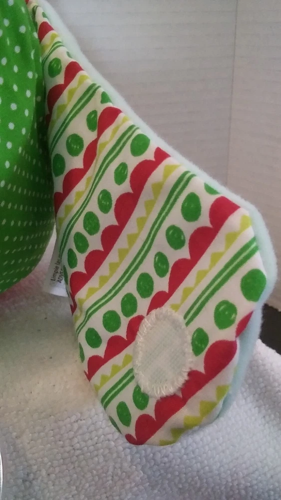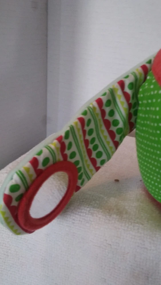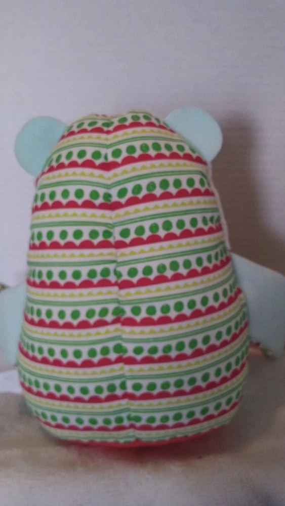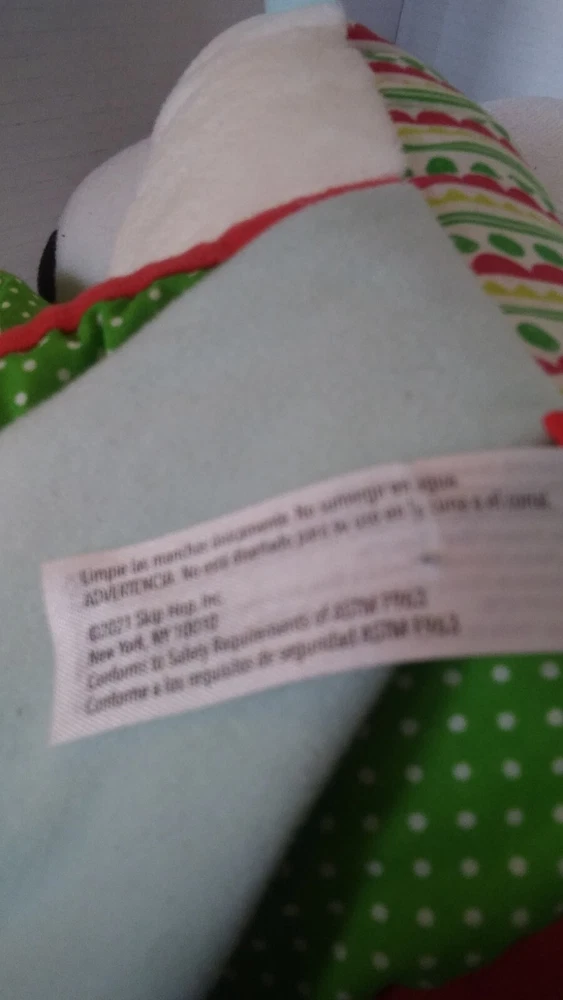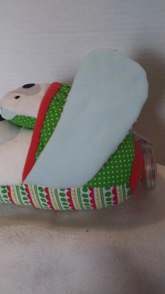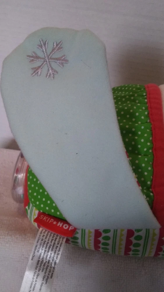 Really cute excellent condition. Has a baby polar bear in front pouch. You could hang this. There is a plastic ring on the bottom and a small mirror on right paw. The baby bear comes out and is very soft. The large bear make a crackling sound when squeezed. This is made to hang from a stroller or seat could be used during tummy time