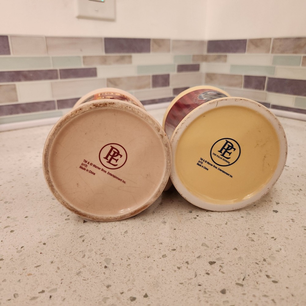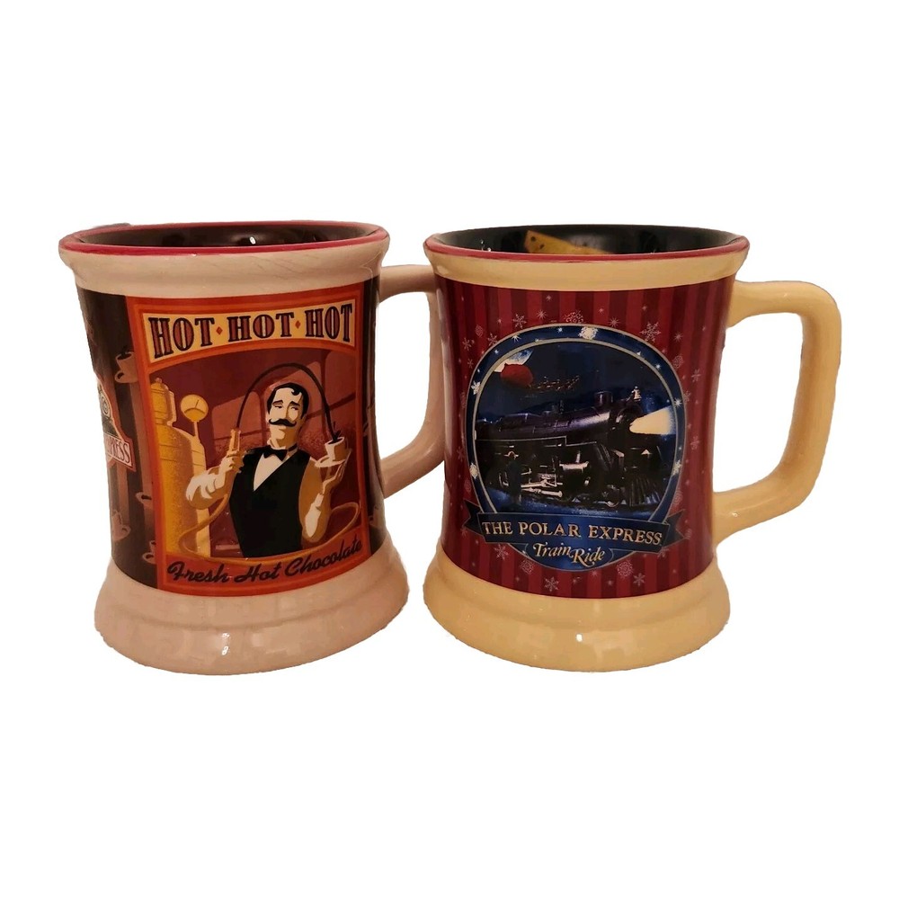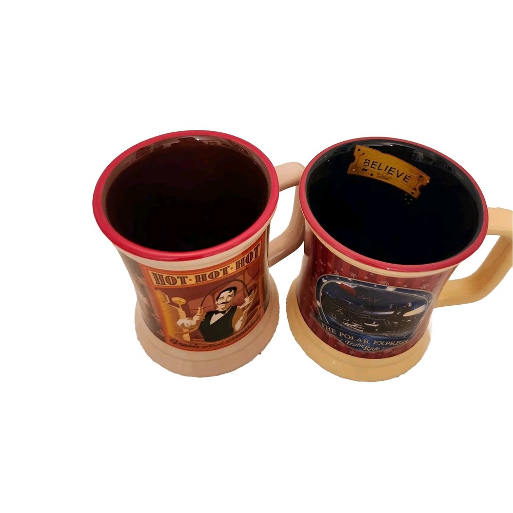 2 mugs based on the movie "The Polar Express (PE)" Train Ride Believe Hot Hot Chocolate Mug Stoneware Coffee Tea Cup TM & Warner Brothers Entertainment Inc. Very good used condition.