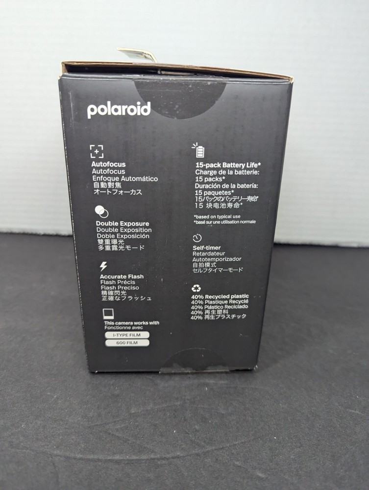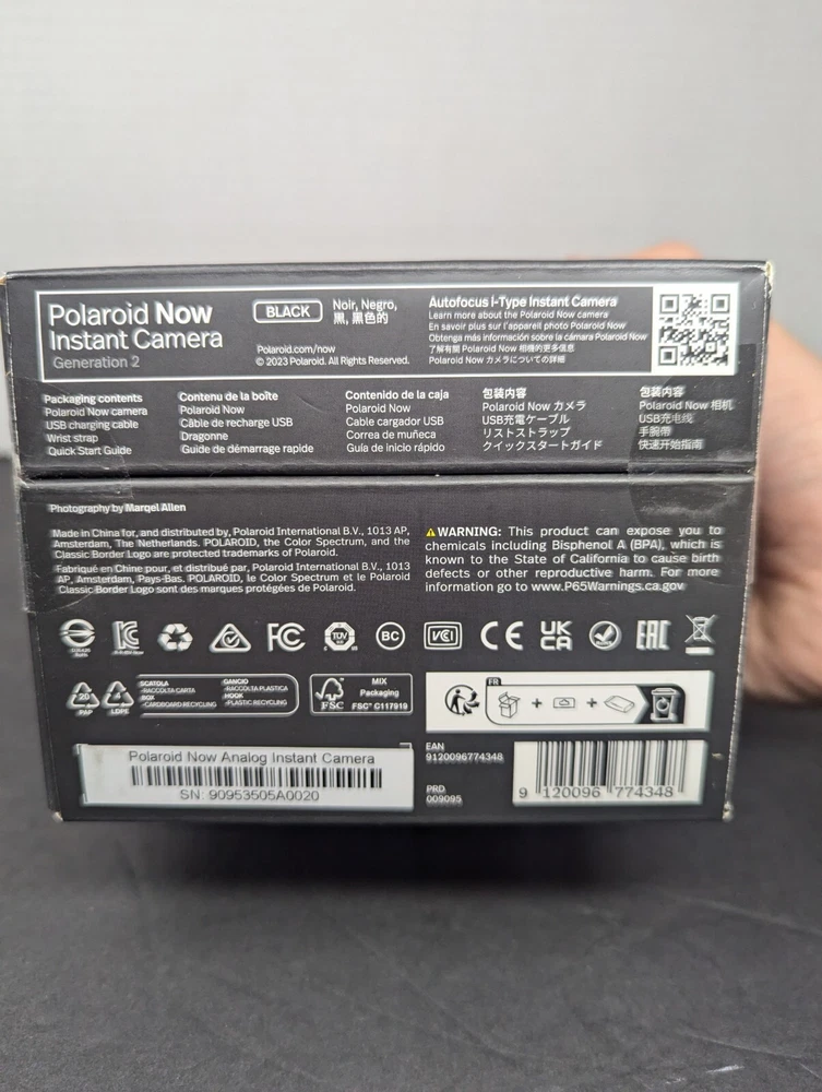 Capture the essence of the moment with the Polaroid Originals Now 2nd Generation I-Type Instant Film Camera in black. This compact camera features auto exposure, built-in flash, and a timer to ensure you take the perfect shot every time. With a lens height of 5 inches, this camera is perfect for capturing stunning photos in the 4 x 6 inch polaroid i-Type format. The camera comes with a 1-year manufacturer warranty and is designed to be easy to use. It is a great addition to any film photography enthusiast's collection. Please note that this camera is designed for use in California without any Prop 65 warning. Get ready to capture life's special moments with this reliable and stylish camera. I did notice that the wrist strap was missing, but everything else is accounted for.
