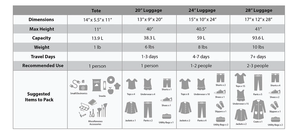 Description This beautiful deluxe 4-piece expandable luggage set is manufactured with a patented heavy duty EVA-molded hi-count fabric. This set is perfect for the serious and experienced traveler! Manufactured with the very best heavy duty polyester and PVC backing, this luggage set is designed for the traveler on the go and comes with three expandable uprights and a flight tote bag. It comes packed with features including: an inside retractable handle, EZ-Roll in-line skate wheels, back zippered secured pockets, top and side comfort grip handle, stability bars at the bottom to avoid tilting, and locks & keys. Upright features include: Clear in-line skate wheel system for smooth ride Push-button self-locking internally stored retractable handle system Ergonomic and comfortable padded top and side grip handles front full size zipper-secured pockets Three internal organizational pockets for all your traveling needs Each upright's interior is fully lined with a durable and elegantly imprinted lining Elegant silver pewter heavy duty industrial hardware Carry-On Flight Tote Bag features include: Elegantly imprinted full interior lining Detachable and adjustable non-slip shoulder strap Spacious main compartment Maximum strength industrial hardware 19-inch Carry-on Upright: 20 inches high x 12. 5 inches wide x 7. 5 inches expandable to 10 inches deep (with wheels). 6 lbs. 24-inch Upright: 24 inches high x 16 inches wide x 10 inches expandable to 12 inches deep. 8 lbs. 28-inch Upright: 28 inches high x 18 inches wide x 12 inches expandable to 14 inches deep. 9 lbs. Carry-On Flight Tote Bag: 14 inches wide x 11 inches high x 5 inches deep – 1 lb. Carry-on Upright: 20"x 12. 5"x 7. 5" (with wheels) 24-inch Upright: 24"x16"x10" 28-inch Upright: 28"x18"x12" Tote: 14"x11"x5" large front pockets Skate wheels Full lining Expandable