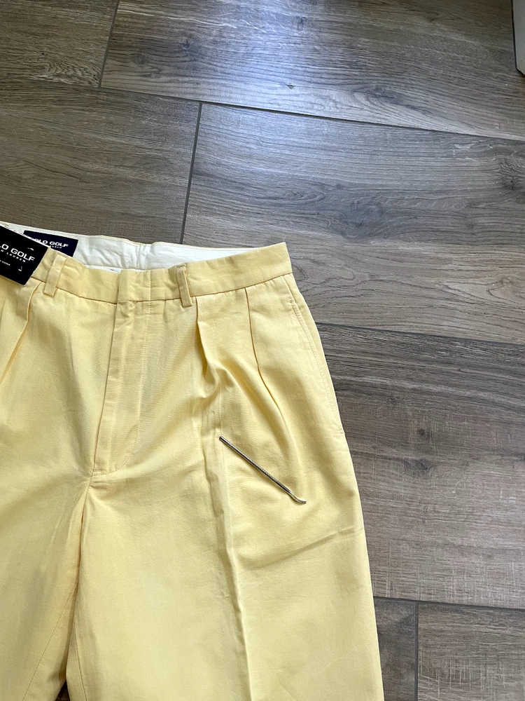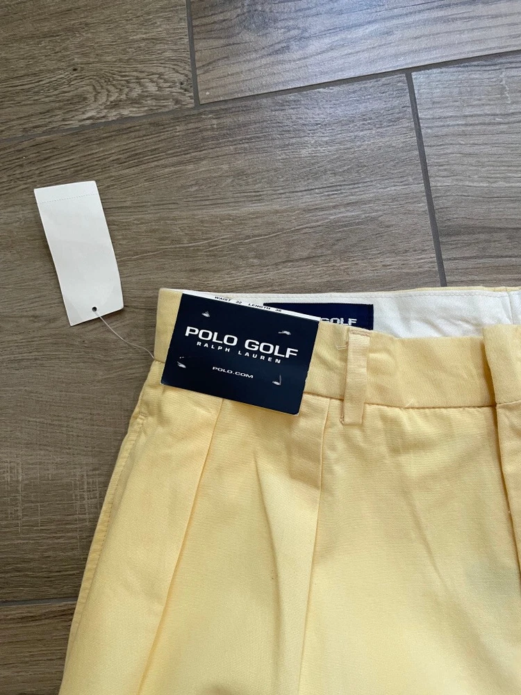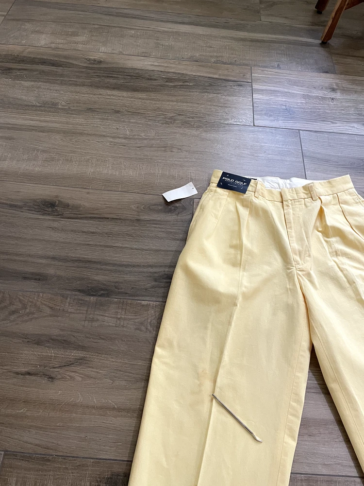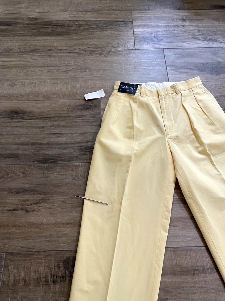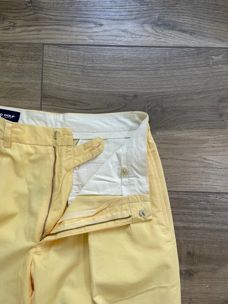 Polo Golf Ralph Lauren Pants Style: Pleated Front Casual Trouser Color: Yellow (brighter color on photos is closer match) Features: Slit and flap button close back pockets Fabric: 100% Cotton Approximate flat measurements: Waist 15 1/2", Rise 13", Inseam 35 1/2" Condition: New with tags/ flaws = with 2 areas of spots shown in last photos that I have not attempted to wash out due to tags Tag Size: 32x36