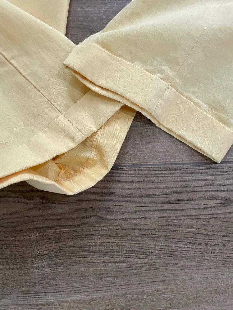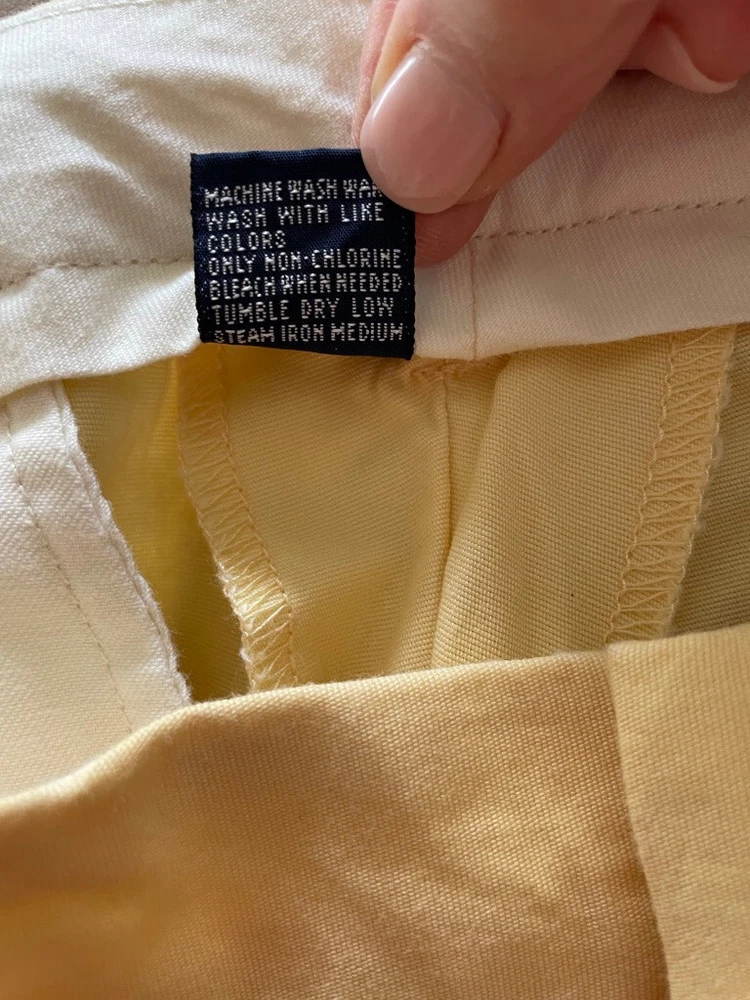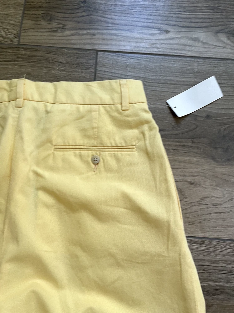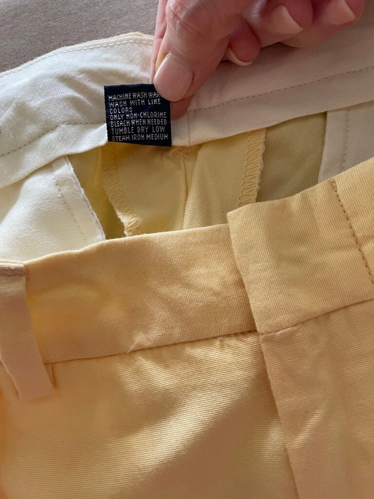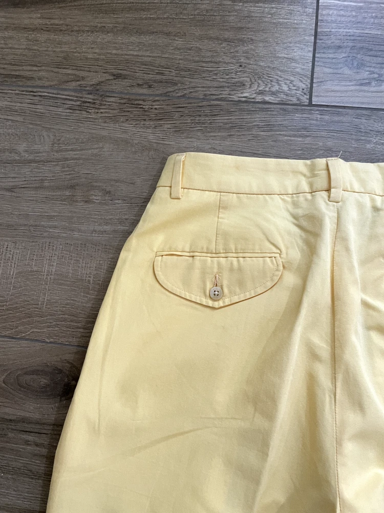 Polo Golf Ralph Lauren Pants Style: Pleated Front Casual Trouser Color: Yellow (brighter color on photos is closer match) Features: Slit and flap button close back pockets Fabric: 100% Cotton Approximate flat measurements: Waist 15 1/2", Rise 13", Inseam 35 1/2" Condition: New with tags/ flaws = with 2 areas of spots shown in last photos that I have not attempted to wash out due to tags Tag Size: 32x36