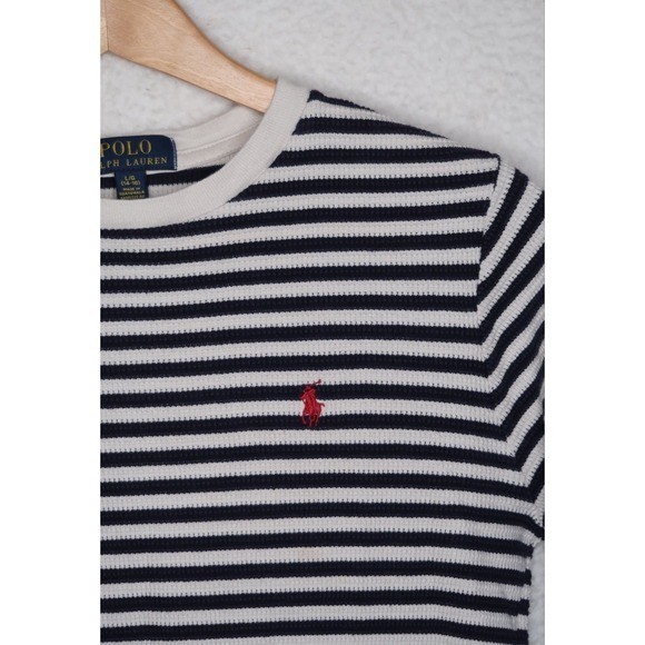 In good condition with slight sleeve wear! Size: Large (14-16) 100% Cotton Approximate Measurements: Shoulder to hem: 21.5" Pit to pit: 18" Notes: polo ralph lauren boys striped long sleeve shirt navy white stripe red pony logo preppy classic crewneck cotton shirt school casual top designer kids clothing classic polo kids Bn 12