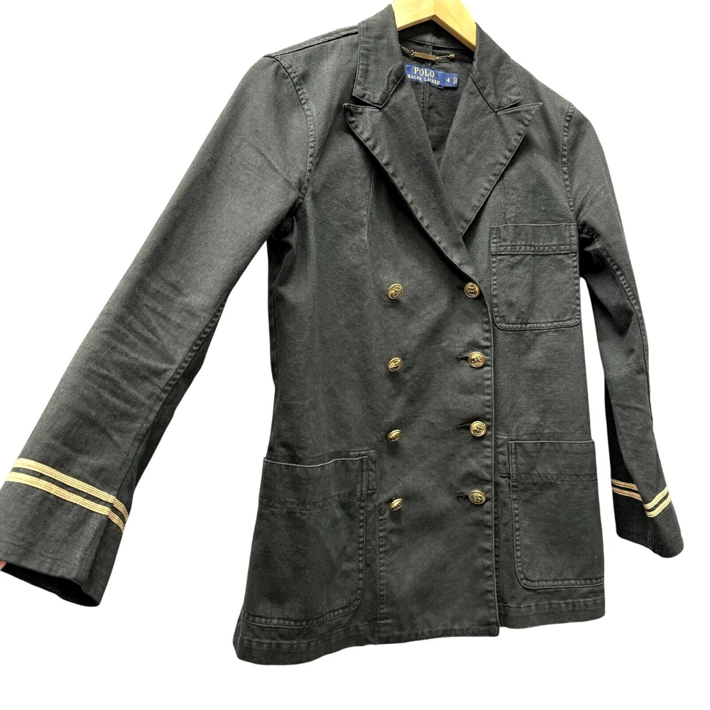Polo Ralph Lauren Blazer Womens 4 Black Denim Military Double Breasted Gold Piping + Pockets Nautical Buttons Cotton Linen Very good condition, see all pictures for views. •Pit to pit: 17" •Shoulder to hem: 27" Ships out same day or next open postal day. Thank you for your purchase, we appreciate you!