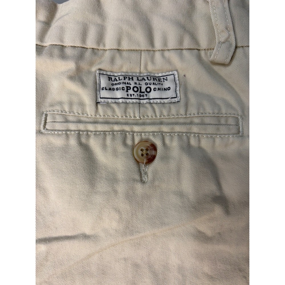 Polo Ralph Lauren classic chino shorts in a versatile beige khaki. Crafted from durable cotton twill, these shorts feature a flat front design with a zip fly and button closure. They include two side slit pockets and two button-through back welt pockets for a clean, traditional look. A woven "Classic Polo Chino" label is featured above the back right pocket, adding a signature touch to this preppy essential. Ideal for casual outings or school uniforms. Note that there is a faint mark on the front left leg as shown in photos.