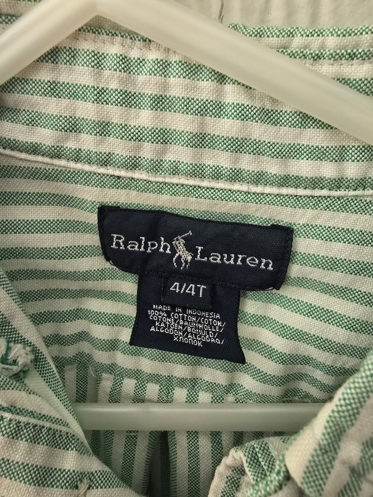 The Polo Ralph Lauren Boys Button-Up Shirt in size 4T is a classic and versatile addition to any young boy's wardrobe. Made from 100% cotton with a medium fabric wash, this green stripe shirt features a collared neckline, long sleeves, and a button-down closure. Perfect for casual occasions in all seasons, it is machine washable for easy care. The shirt is designed with a regular fit and a button-down collar for a timeless and polished look. Ideal for school or everyday wear, this Polo Ralph Lauren shirt combines comfort and style effortlessly.