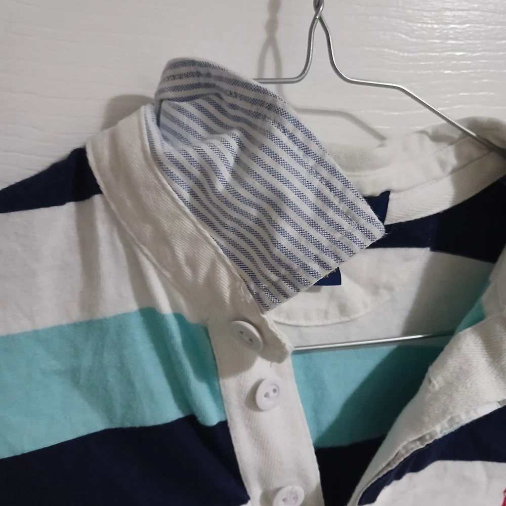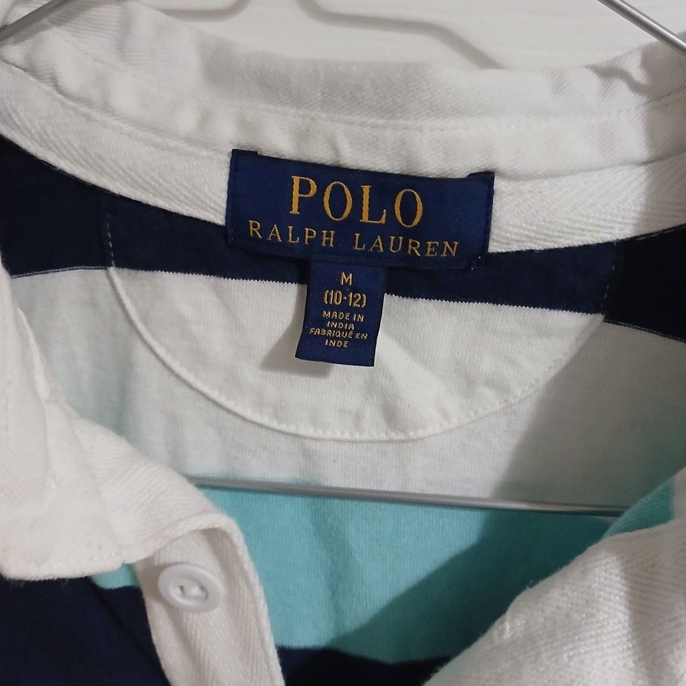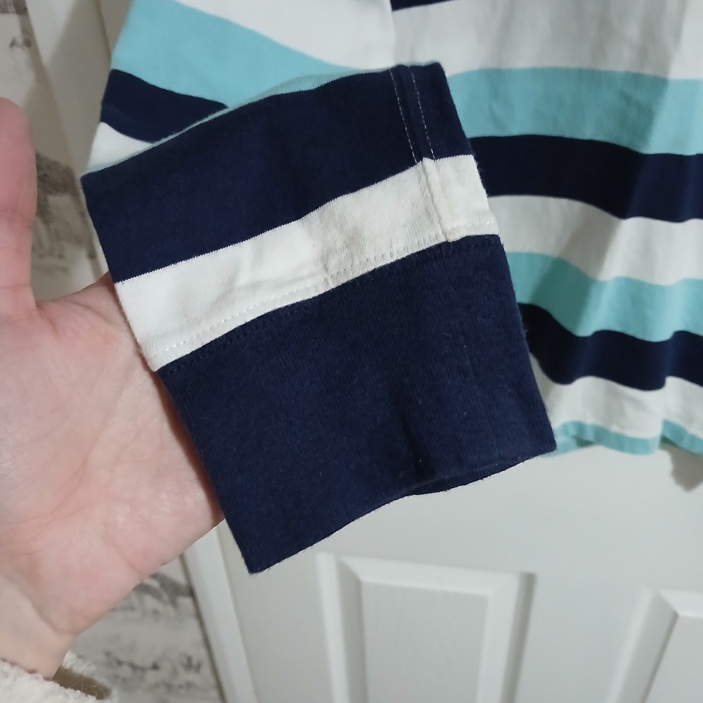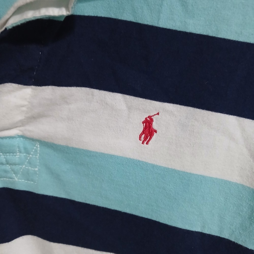 The Quintessential Ralph Lauren Look Dress him in a timeless classic. This Polo Ralph Lauren Iconic Rugby Shirt perfectly balances sporty energy with a polished, Ivy League aesthetic. Whether for a family photo, a school event, or a casual weekend, this shirt is built to look sharp and last through every adventure. Why You'll Love It: Signature Style: Features a crisp white twill collar and a vibrant red embroidered Pony on the chest. Nautical Vibes: Bold horizontal stripes in Navy and Aqua/Light Blue for a fresh, clean look. Built to Last: Crafted from heavy-duty 100% cotton jersey with a hidden rubber-button placket designed to handle wear and tear. Comfortable Fit: Ribbed cuffs and a vented hem allow for easy movement without losing shape. Condition Note: This shirt is in good condition. I have included close-up photos of a couple of very small, faint marks to ensure you know exactly what you’re receiving. Please review all images to see the high quality of the fabric. Verified Flat Lay Measurements: Shoulder to Shoulder: 16" Pit to Pit (Chest): 17" Length: 22" (Top of shoulder to hem)