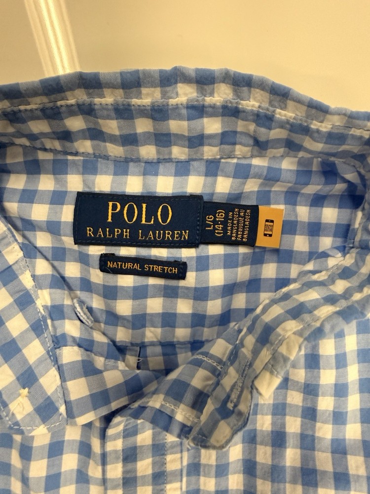 The Polo Ralph Lauren Boys Shirt in size large (14/16) is a classic and stylish addition to any young boy's wardrobe. Made from comfortable cotton knit fabric, this short sleeve button-up shirt features a solid blue color with a collared neckline and the signature Polo Ralph Lauren logo accent. Perfect for casual occasions in the summer, fall, or spring, this shirt is machine washable and designed for a regular fit. The timeless design and quality brand make it a versatile piece that can be worn for various activities and school events.