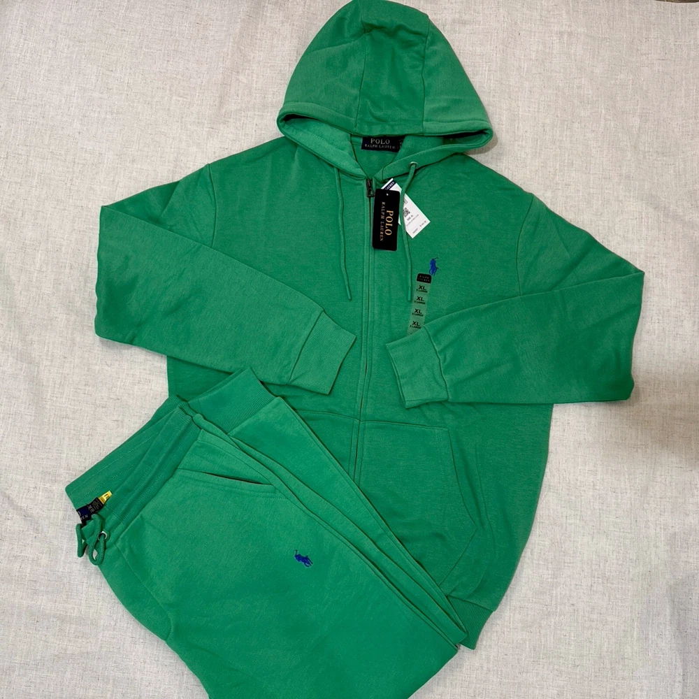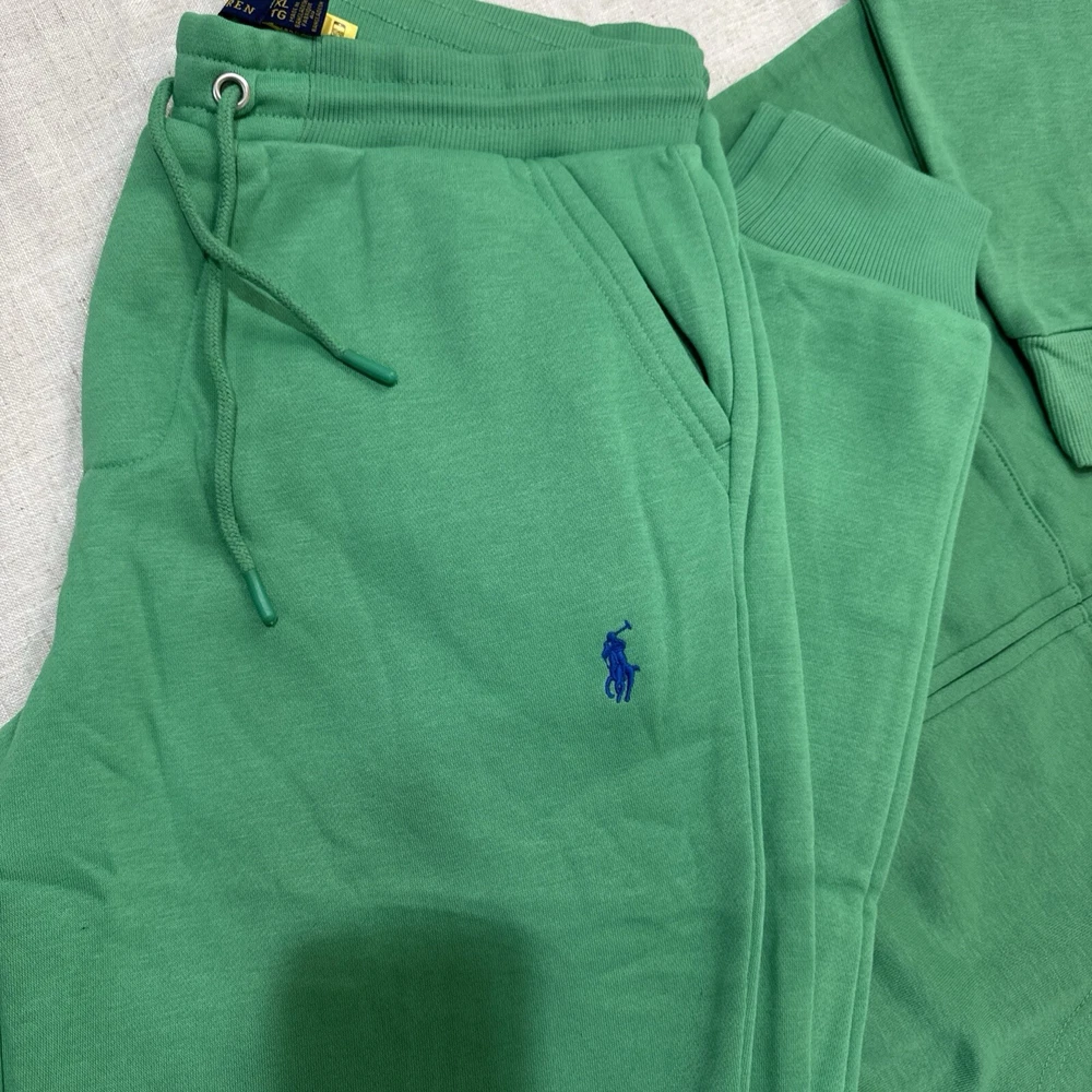 Elevate your activewear collection with this two-piece Polo Ralph Lauren tracksuit in a stunning green color. The set includes a hoodie and joggers, both made of comfortable and lightweight fleece material. The pullover closure and adjustable waist ensure a perfect fit for any occasion, whether it's a casual day out or a formal event. The tracksuit features a solid pattern with accents of a zip and the iconic Ralph Lauren logo. It's machine washable and easy to care for, making it a perfect choice for all seasons. The set is ideal for various activities, including cycling, running, gym training, and more. Get ready to look stylish and comfortable in this Ralph Lauren tracksuit.