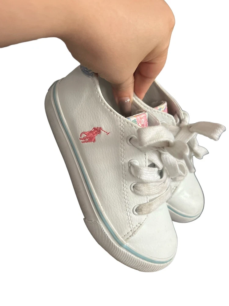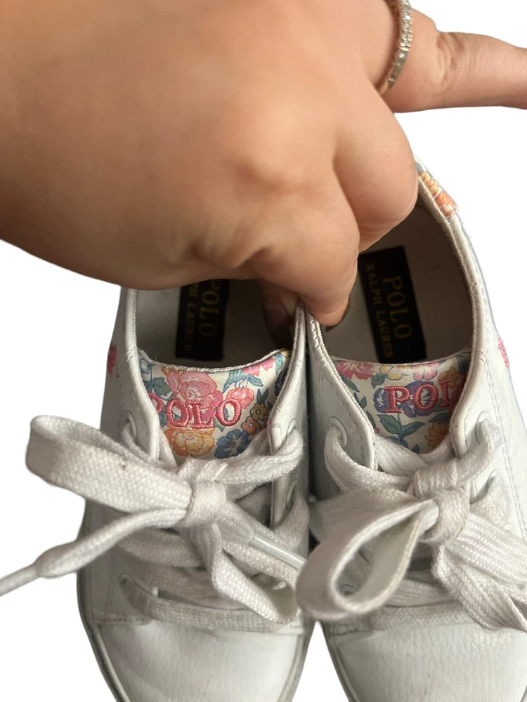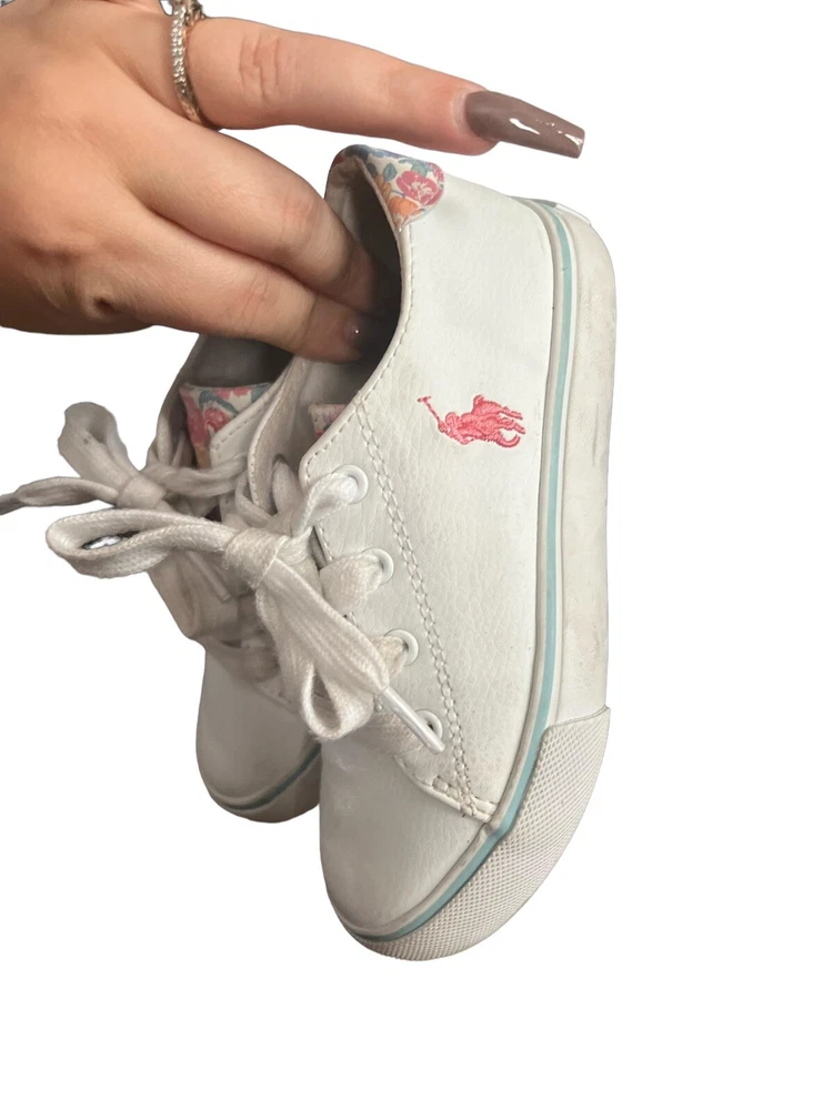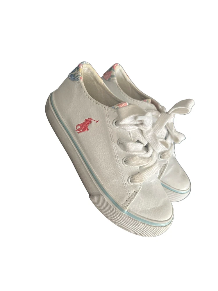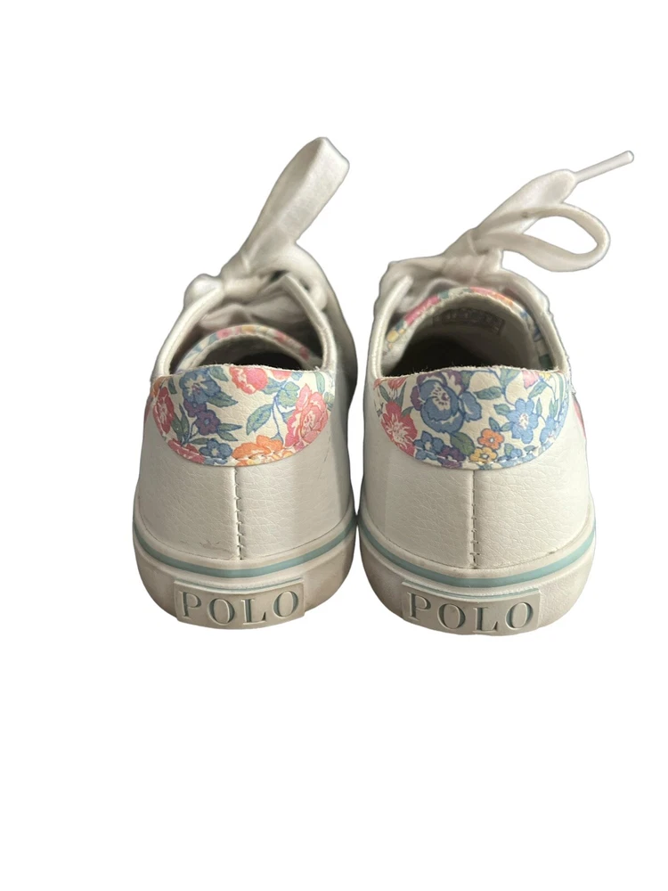 Add some floral flair to your little girl's sneaker collection with these Polo Ralph Lauren Floral Sneaker Shoes. The low-top shoes feature a white textile upper adorned with a beautiful floral pattern, perfect for a casual occasion. The flat heel style and metal cleat type ensure comfort and durability, making them an ideal choice for everyday wear. These sneakers are branded with Polo Ralph Lauren and Little Angel, and are ideal for girls who love flowers.size 10c