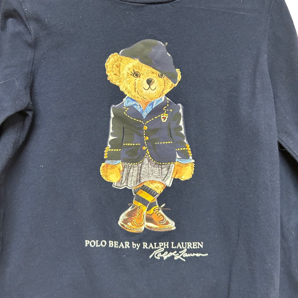 Polo Bear cotton long-sleeve tee showcases the iconic mascot in a sophisticated prep school-inspired outfit, complete with a blazer, beret, and pleated skirt. Crafted from soft washed cotton jersey, this navy blue top offers a comfortable crewneck silhouette and a classic straight hem. The detailed graphic print is accented by the "Polo Bear by Ralph Lauren" signature script for an authentic heritage look. Brand: Ralph Lauren Line: Polo Bear Size: Small (7) Color: Navy Blue Material: 100% Cotton Sleeve Length: Long Sleeve Neckline: Crew Neck Pattern: Graphic Print Style: Preppy Fit: Regular Department: Girls Keywords: Preppy, Collegiate, Academic, School Girl, Classic, Designer, Iconic, Mascot, Teddy Bear, Navy, Fall Fashion, Back to School All items come from a smoke free, golden retriever dog friendly home. All of items unless NWT or Dry Clean Only are washed with Tide. We try our best to disclose any flaws with items, if we miss something please reach out and let us know.