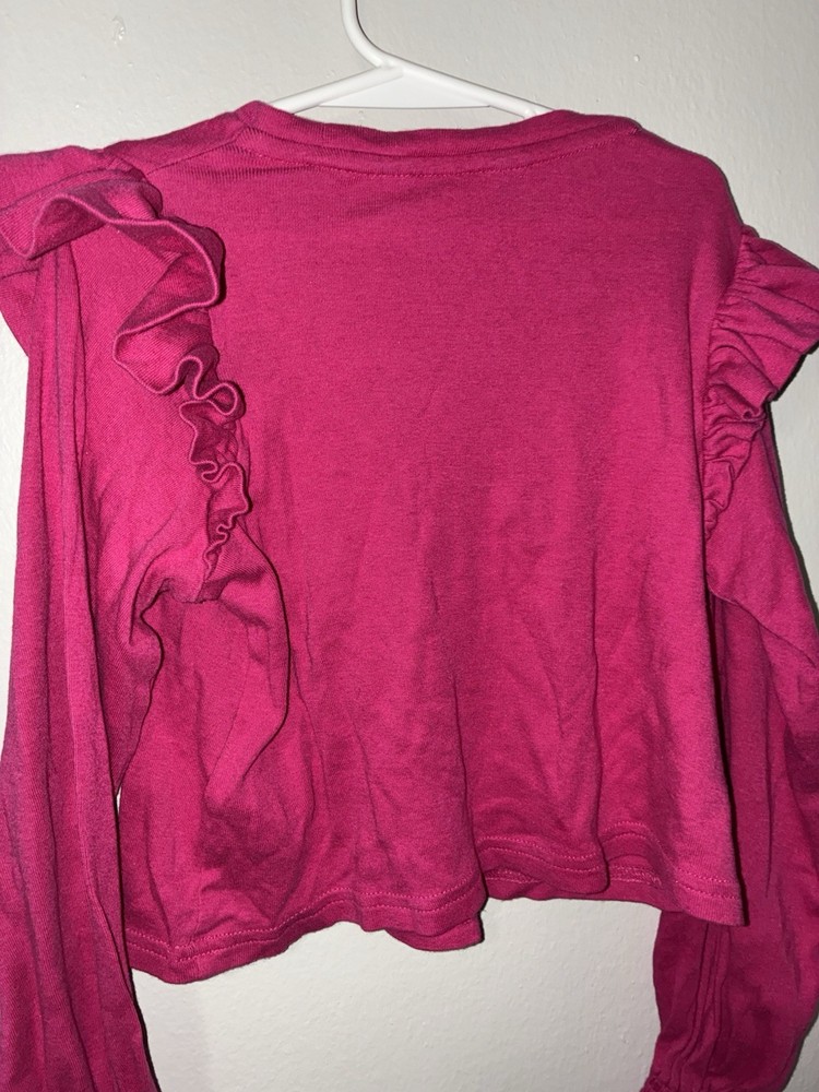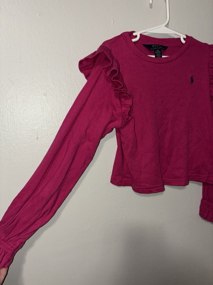 Department:GirlsType:T-ShirtFeatures:Ruffle, LogoBrand:Polo Ralph LaurenSize:6XNeckline:Crew NeckSleeve Length:Long SleeveColor:PinkStyle:PulloverAccents:Ruffle, LogoOccasion:CasualPattern:SolidClosure:PulloverSeason:Fall, Spring