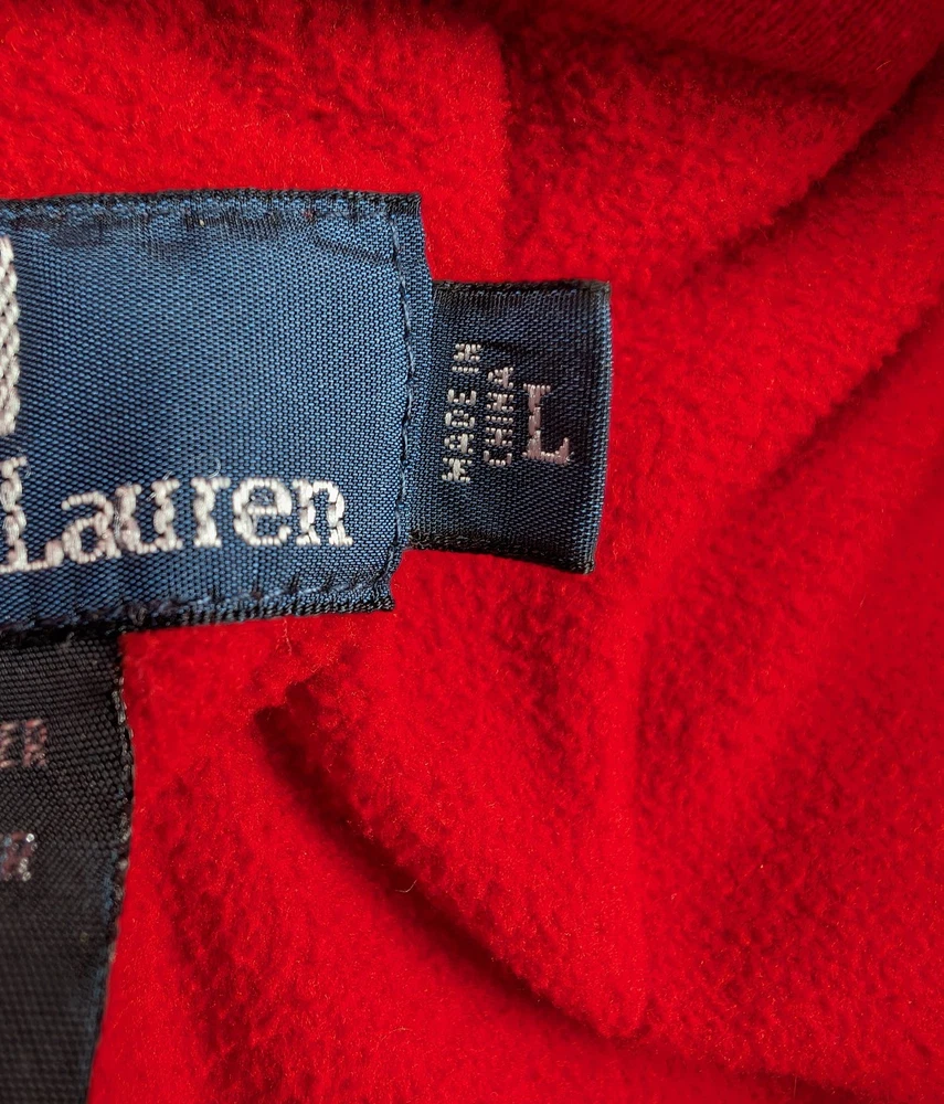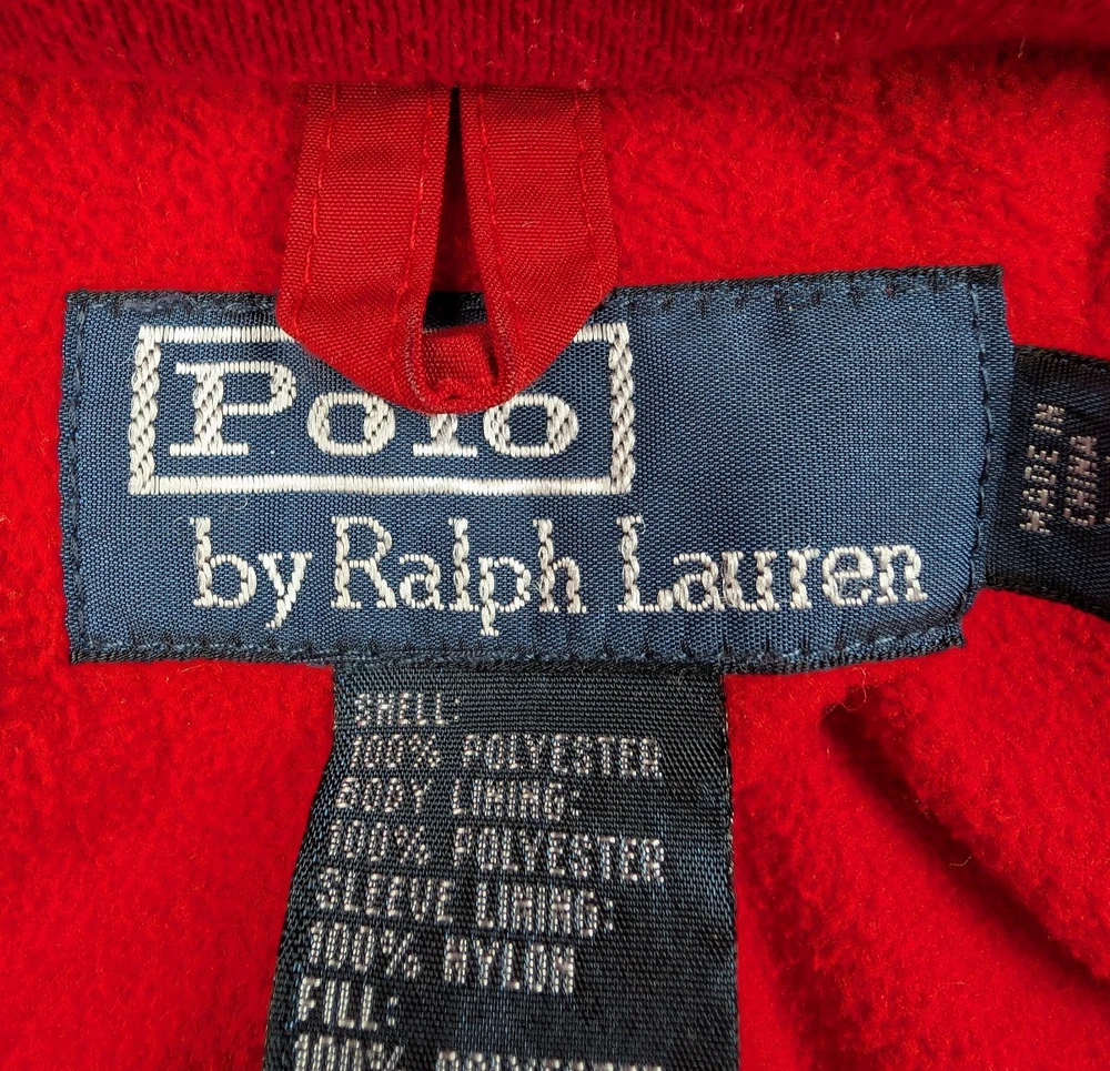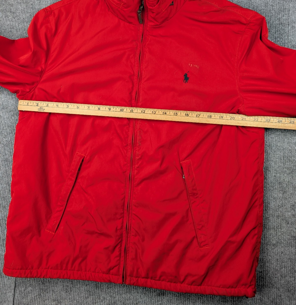 Brand: Polo Ralph Lauren Department: Men Size: L Color: Red Style: Windbreaker Jacket Type: Jacket Outer Shell Material: Polyester Lining Material: Fleece Closure: Zip Features: Full zip, pockets, fleece lined Occasion: Casual, Outdoor Pattern: Solid Country/Region of Manufacture: Bangladesh Condition: Pre-owned