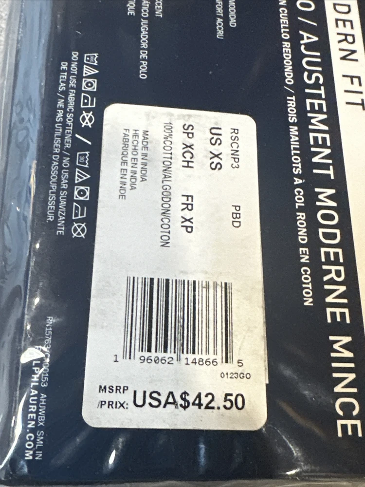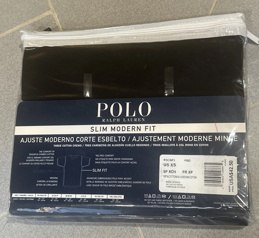 This Polo Ralph Lauren Men's Black Crew Slim Fit Undershirt 3-Pack T-Shirt in XS size is a perfect addition to your wardrobe. The shirt is made of 100% cotton material and is machine washable for easy maintenance. It features a solid pattern, crew neckline, and tagless design for added comfort. The shirt also has a slim fit and comes with a logo accent, making it a stylish choice for any occasion. Ideal for men who are looking for a comfortable and fashionable t-shirt, this Polo Ralph Lauren shirt is a great choice.