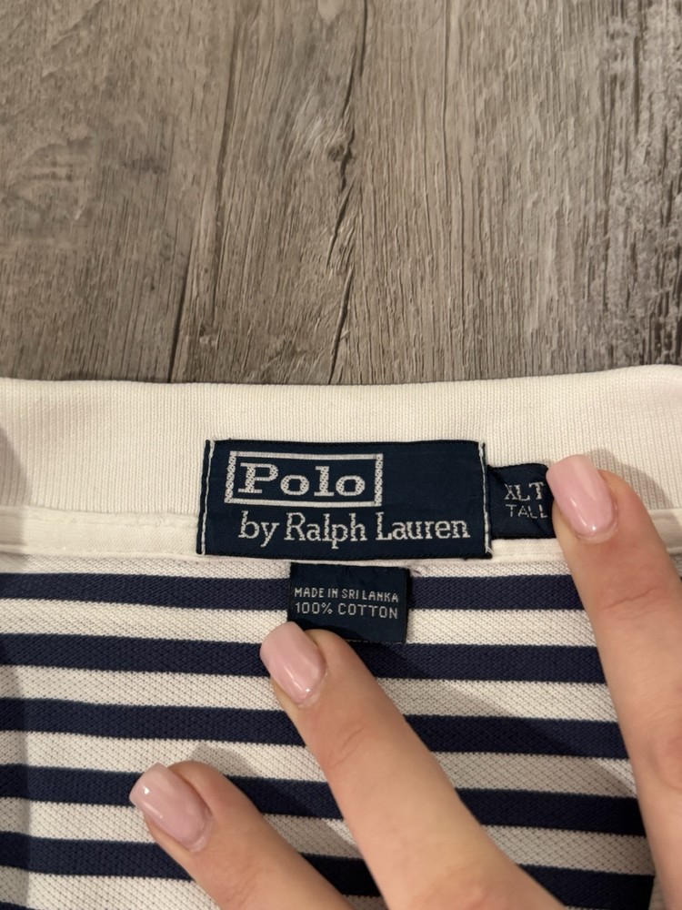 This is a vintage Polo Ralph Lauren men's short sleeve polo shirt in size XLT (Big & Tall) with a blue and white striped pattern. Made of 100% cotton fabric, this polo shirt features the iconic Ralph Lauren brand logo and is designed for a comfortable and stylish fit. Perfect for a casual yet classic look, this shirt is a timeless addition to any wardrobe for men who appreciate quality and fashion.