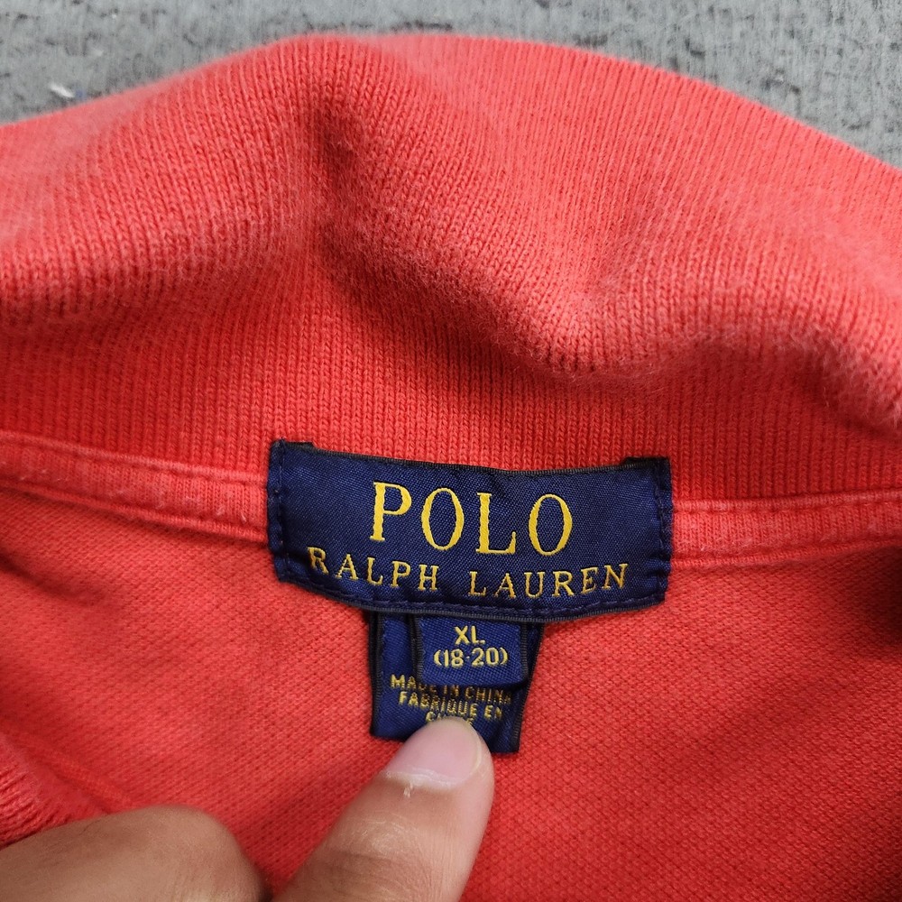 Polo Ralph Lauren polo shirt in boys size XL (18-20) with a solid orange short sleeve collared silhouette designed for casual everyday wear. Tag details: Interior neck label shows POLO RALPH LAUREN branding, size XL (18-20), and MADE IN CHINA country of origin text. Color and fabric: Soft cotton piqué knit fabric in a rich orange tone, offering breathable comfort suitable for warm weather and layering across seasons. Features: Rib-knit polo collar, two-button front placket with matching buttons, short sleeves with rib trim, straight hem with side vents, and a regular fit boys polo silhouette. Design details: Contrasting blue embroidered Polo Pony logo on the left chest adds classic Ralph Lauren styling to the solid color knit body. Additional details: Timeless polo shirt pairs easily with jeans, chinos, or shorts for school, family outings, or casual events throughout the year. Storage details: Shirt is stored folded in a clear plastic bag with a small white inventory sticker labeled '8409' applied near the collar as pictured; please review all photos for visual confirmation of style and design. Use: Versatile Polo Ralph Lauren boys polo shirt ideal for casual, school, and weekend outfits.