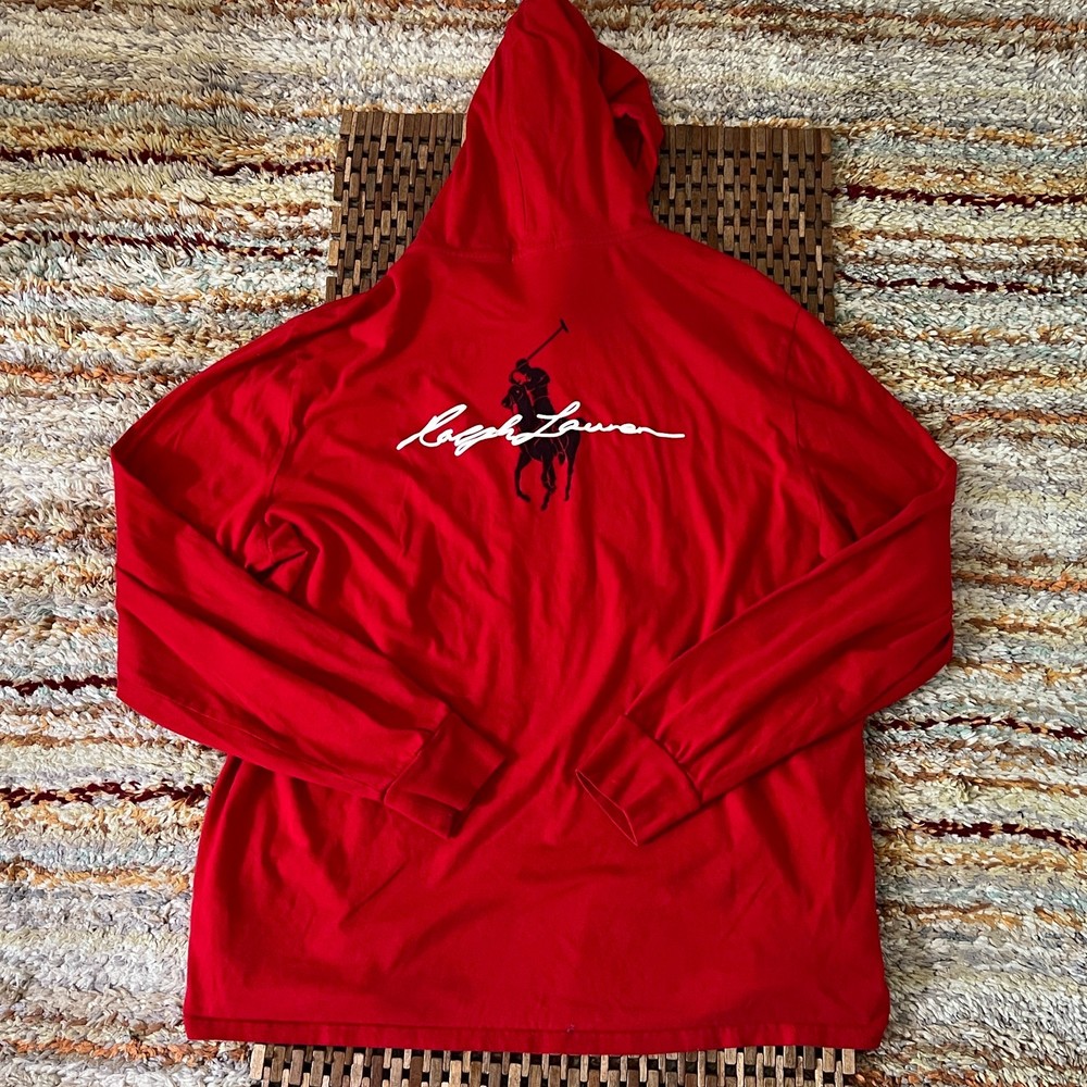 The product is a men's XL Polo Ralph Lauren red pullover hoodie featuring the iconic Big Pony graphic. Made from cozy cotton fleece material, this hoodie is perfect for the winter, fall, and spring seasons. With a classic solid design and long sleeves, this hoodie is machine washable for easy care. It comes in a regular fit with a hooded style, making it a stylish and comfortable addition to any man's wardrobe.