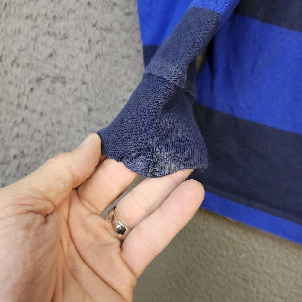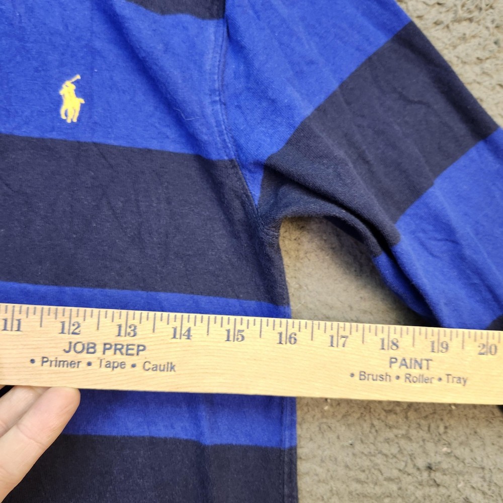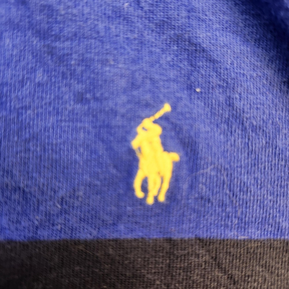 Polo Ralph Lauren Rugby Shirt Boys Medium 10-12 Blue Black Striped Long Sleeve Top Condition: Good used condition with moderate wear, some general fading and wear, small flaw/repair on left sleeve cuff as shown in photos Classic bold blue and black wide horizontal rugby stripes Signature yellow Ralph Lauren polo player logo embroidered on left chest White woven collar and partial button placket Tag size: Medium (10-12) Youth/Boys Approximate flat measurements shown in photos: pit to pit ~17.5", back length from collar ~22.5" Made in India Great layering piece for casual or preppy style
