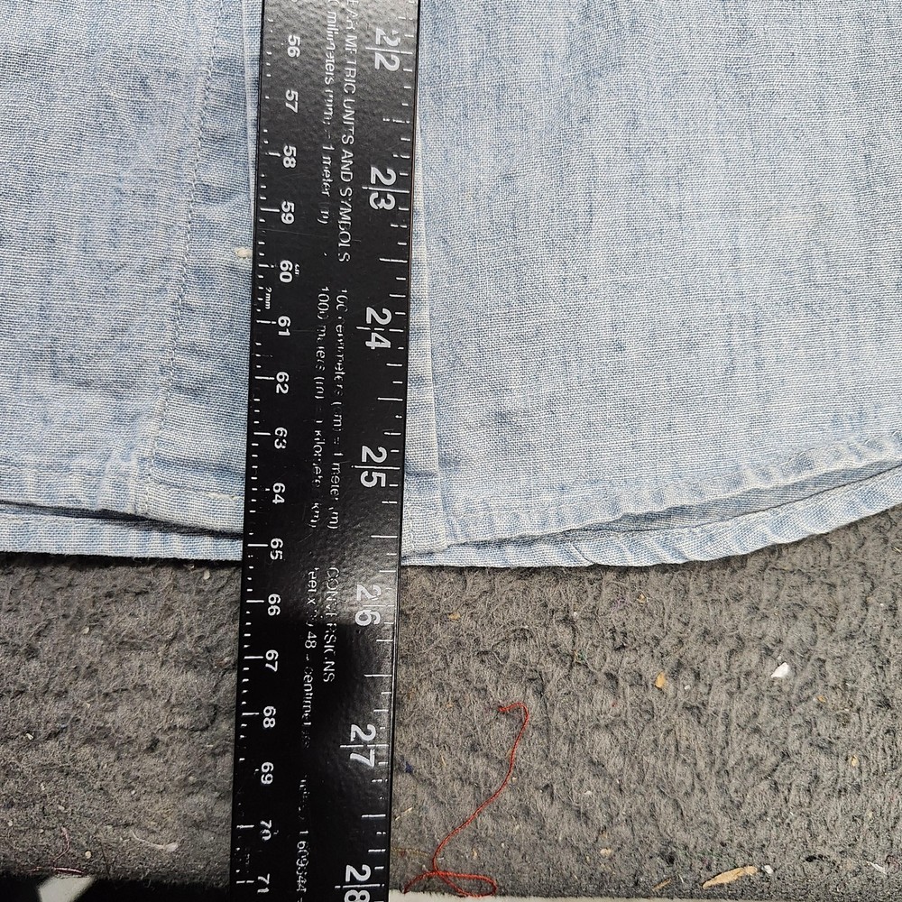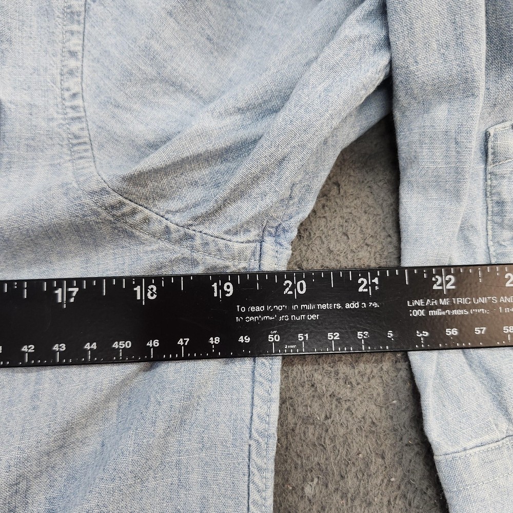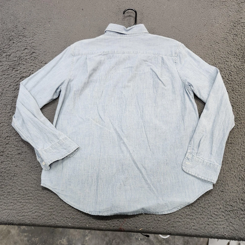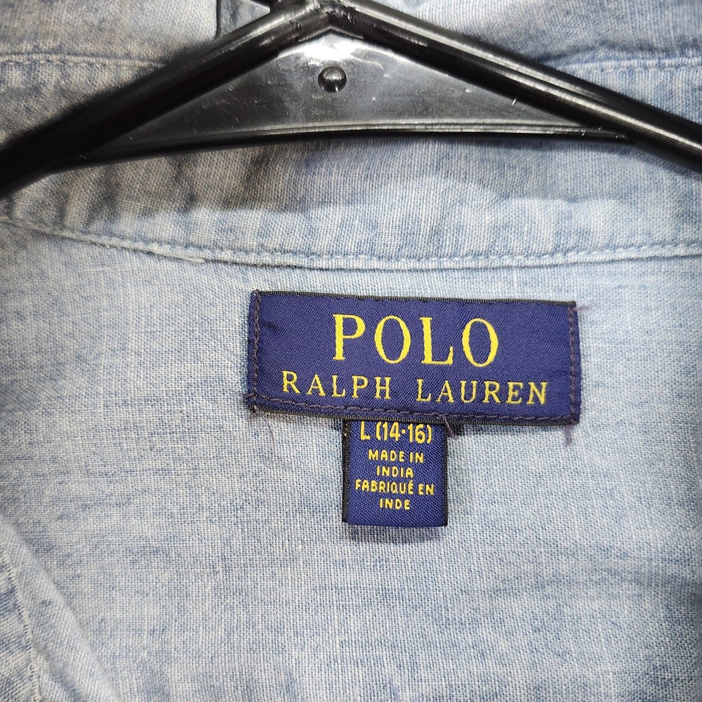 Polo Ralph Lauren shirt in boys size Large 14-16 with a blue long sleeve button-front collared silhouette designed for casual wear and layering. Tag details: Interior neck label shows POLO RALPH LAUREN branding and size L (14-16) text. Color and fabric: Light blue chambray-style woven fabric with subtle texture throughout for a classic denim-inspired look suitable for everyday wear. Features: Point collar, full button-front placket with light buttons, long sleeves with button cuffs, back yoke with pleats, and curved shirttail hem for comfortable movement and easy layering. Design details: Two front chest patch pockets with button closures, left pocket featuring a small woven POLO logo tab for subtle branding. Additional details: Inventory sticker labeled '6571' is attached at the upper back as pictured. Use: Versatile boys button-up shirt suitable for school, casual outfits, or layering over tees; please review all photos for additional visual details and confirmation of style and design.