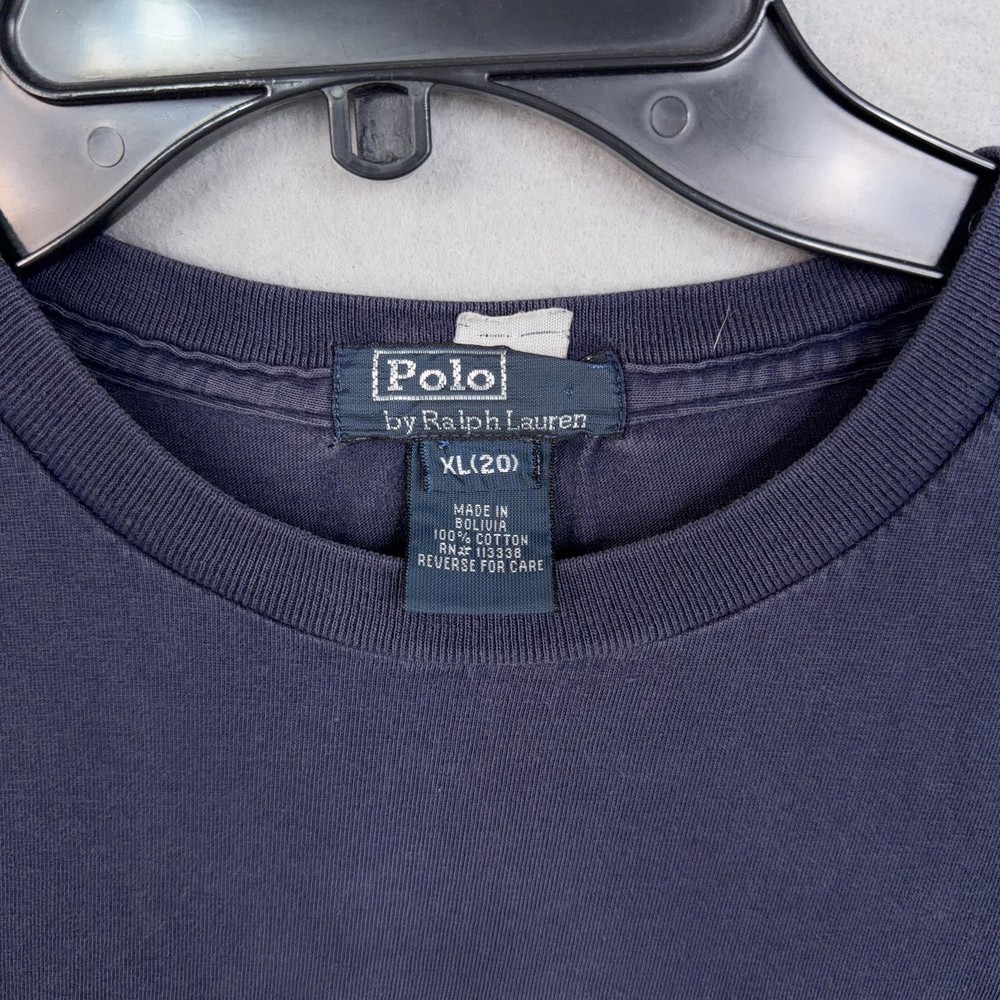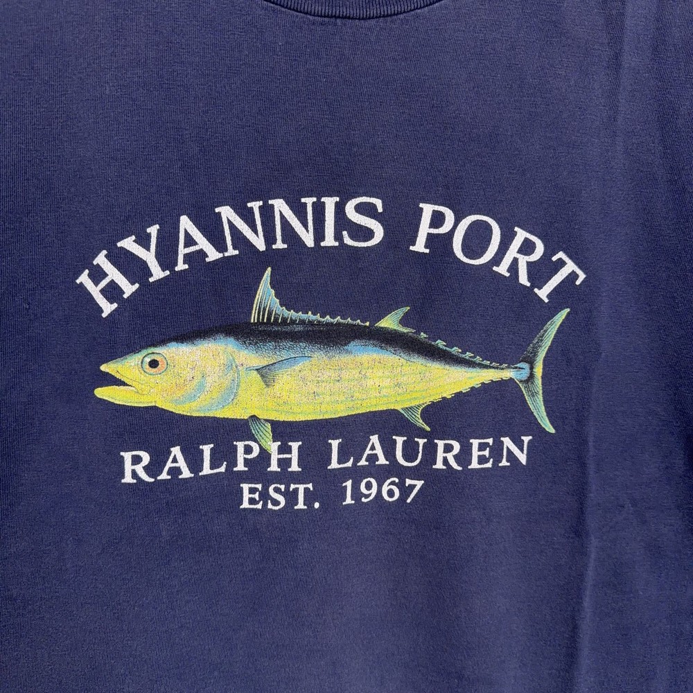Polo Ralph Lauren Shirt Boys XL 20 Navy Blue Hyannis Port Fish Graphic Tee Beach Pinhole and darker spot at bottom. Pre-owned Polo Ralph Lauren boys graphic t-shirt with overall wear from normal use. Fabric, seams, and hem are intact with a soft feel; small pinhole at the lower front near the hem and a faint spot on the back are shown in photos. Interior tags are present; original retail tags and packaging are not included. Brand: Polo Ralph Lauren Item: Boys short sleeve graphic shirt Color/Pattern: Navy blue with Hyannis Port Ralph Lauren fish graphic in yellow, green, and blue with white text at the front. Size on tag: XL (20) Materials: 100% cotton jersey knit (per tag). Country of origin: Made in Bolivia (per tag). Design details: Crew neckline, short sleeves, straight hem, pullover construction, and soft midweight knit suitable for casual everyday wear. Branding/Logos: Hyannis Port Ralph Lauren Est. 1967 fish graphic printed across chest; woven Polo by Ralph Lauren neck label; interior care tag at side seam. Tags/Codes: Interior tag notes 100% cotton, made in Bolivia, and care instructions on reverse. Notes: Nautical-themed Polo Ralph Lauren boys tee ideal for beach trips, coastal vacations, or casual school outfits; please review all photos for full design details. 25680 Measurements: Previous washings may change sizing on the tag. Refer to photos above for all measurements. Compare our measurements to one of your favorite garments. Measurements are approximate. All items are bagged and sealed after being photographed, then stored in a smoke free environment. Washed per eBay standards. I carefully package and ship daily. Contact me with any questions. Thanks