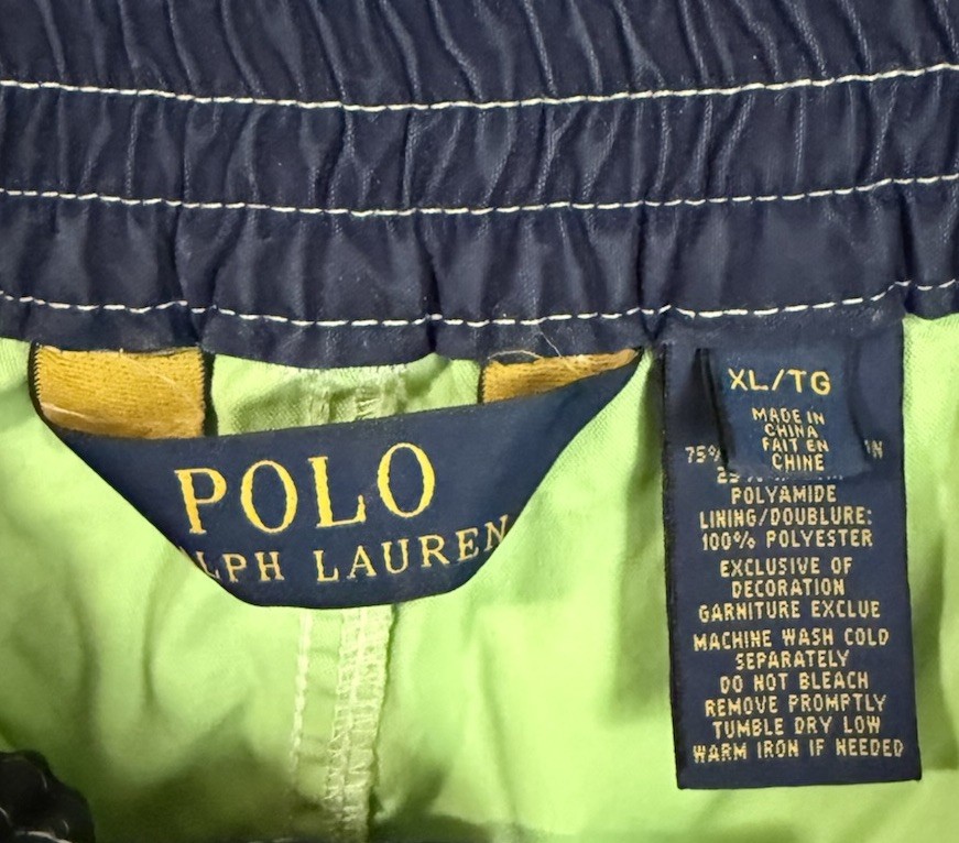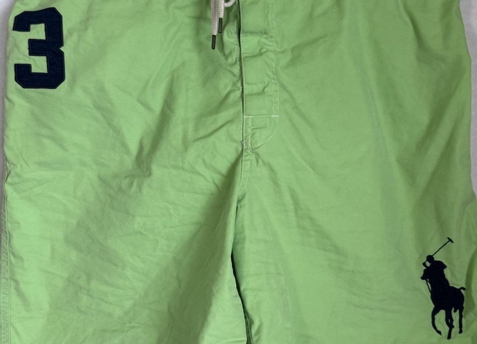 The product is a pair of Polo Ralph Lauren men's XL green swim shorts with a blue #3 pony logo, perfect for a beach or poolside look. These swim trunks are lined with polyester for added comfort and durability, made from a softshell fabric of nylon and cotton. The shorts feature an elastic waistband, quick-dry capabilities, and a drawstring for a customized fit. With a board shorts style and above-the-knee length, these swim bottoms are both stylish and practical for recreational water activities. Machine washable for easy care, these shorts are a stylish addition to any man's swimwear collection.