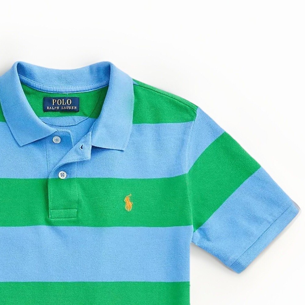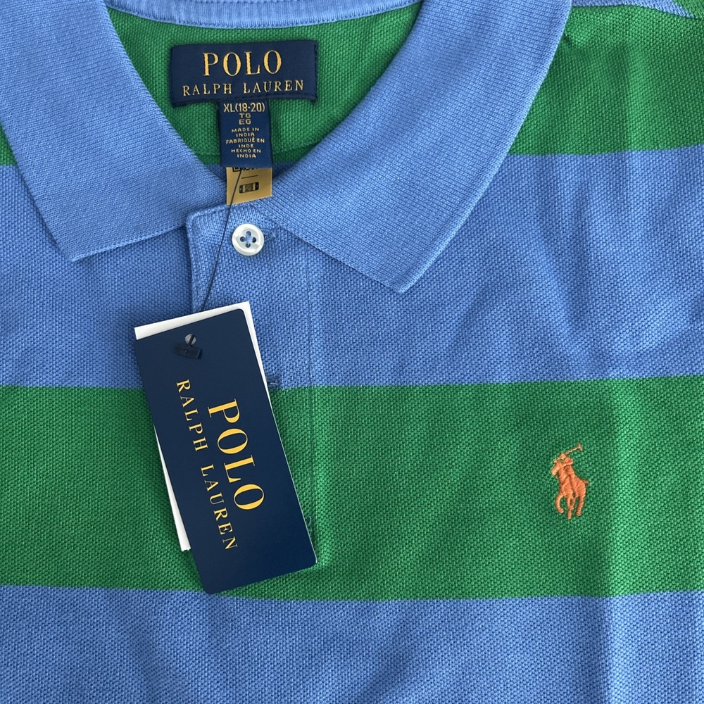 The product is a new with tag Polo Ralph Lauren striped cotton mesh polo shirt in big boy's size XL (18-20). Made from comfortable cotton material, this polo shirt features a classic striped pattern and a breathable mesh fabric type. Designed for boys, this stylish top adds a touch of sophistication to any casual outfit. Perfect for school, play, or everyday wear, this polo shirt from Polo Ralph Lauren is a versatile and high-quality addition to any young boy's wardrobe.