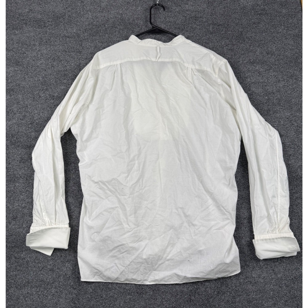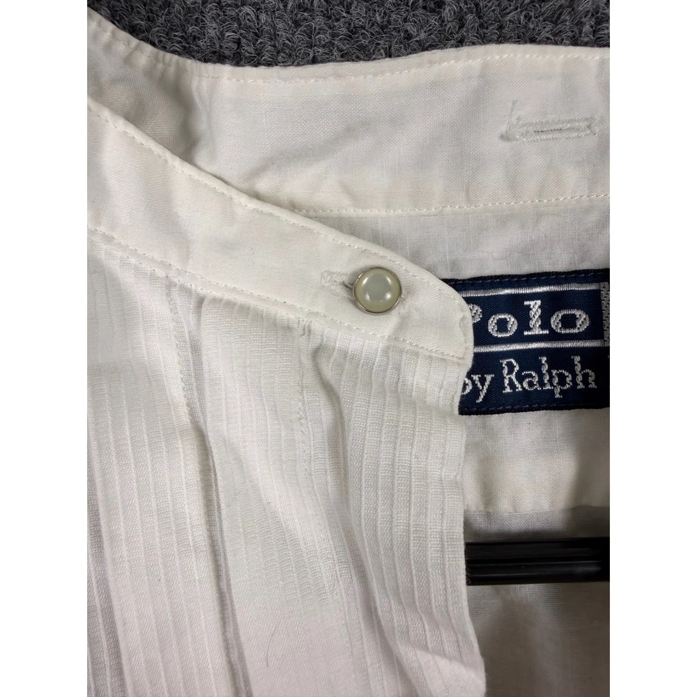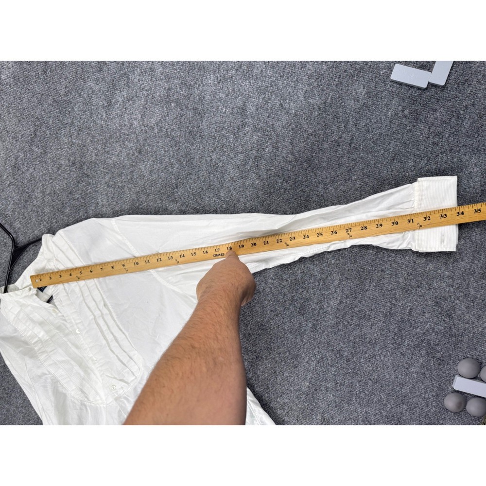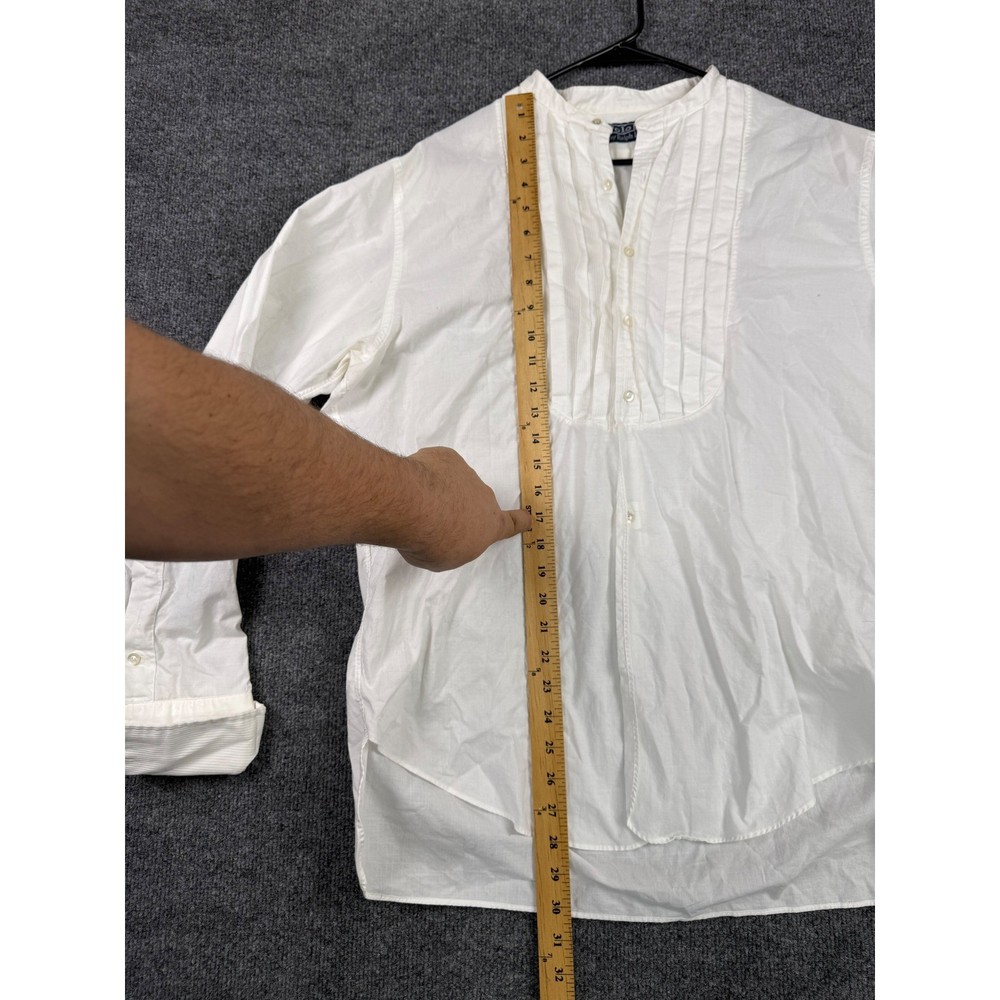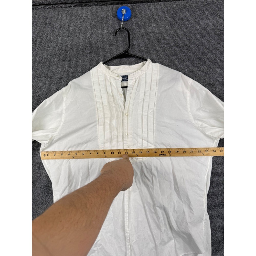 Polo Ralph Lauren tuxedo shirt crafted from crisp 100% cotton in a classic white. This long-sleeve top features a sophisticated band collar and a pleated bib front, offering a refined take on traditional formalwear. The shirt is designed with a partial button placket (popover style) and French cuffs, requiring cuff links for a polished finish. A curved hem and box pleat at the back ensure a comfortable, tailored fit suitable for formal occasions or elevated casual styling. Measurements: • Pit-to-pit: 25" (50" chest) • Length: 31" • Sleeve length: 34" Thank you for looking! I sure appreciate it and strive to make every listing accurate and include any flaws I find. Please note, look at all the pictures for condition and also for color, sometimes the lighting makes some pics look different that others. Have a great day!