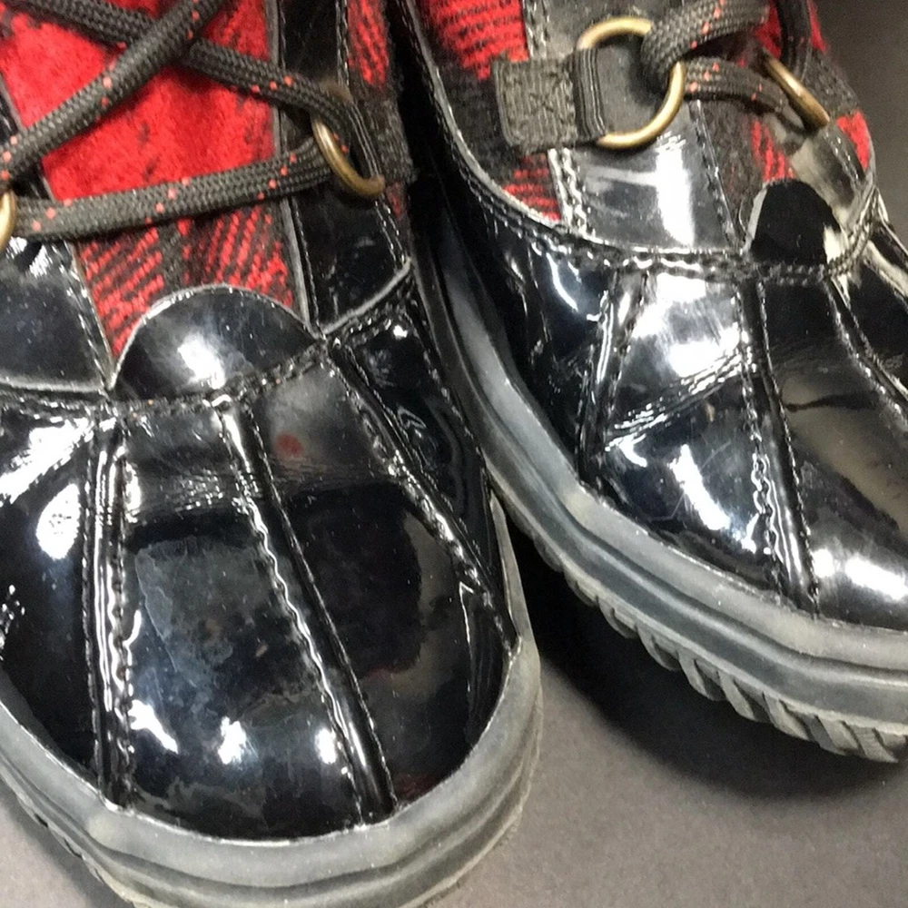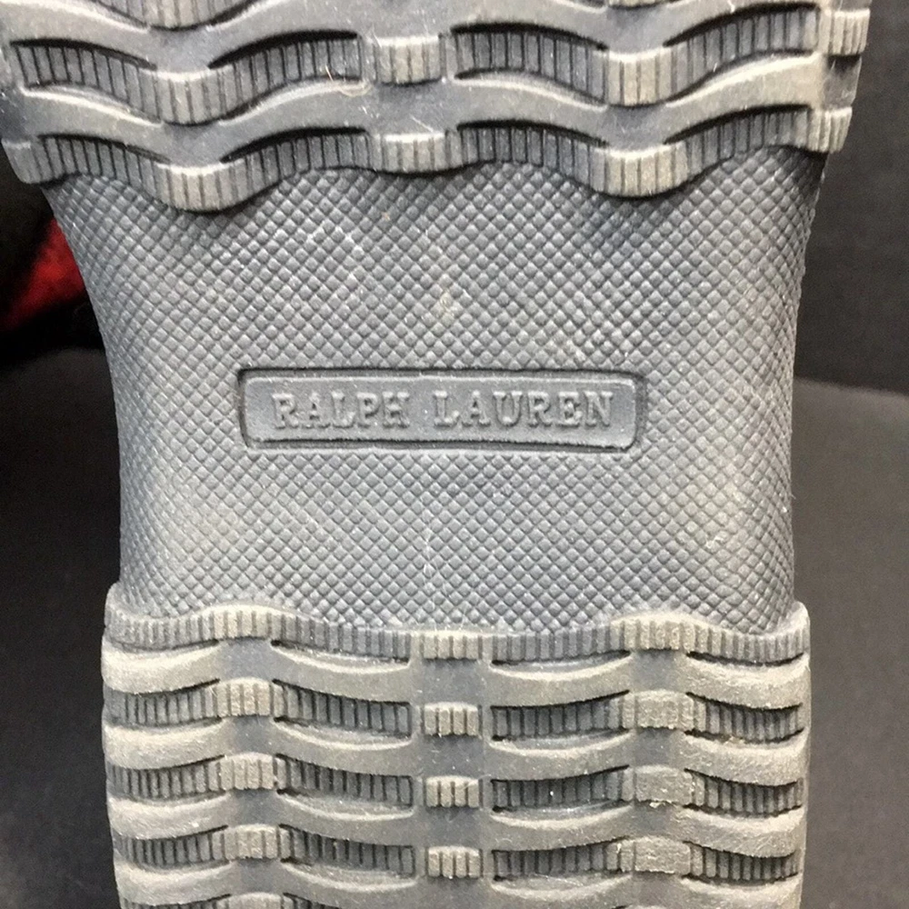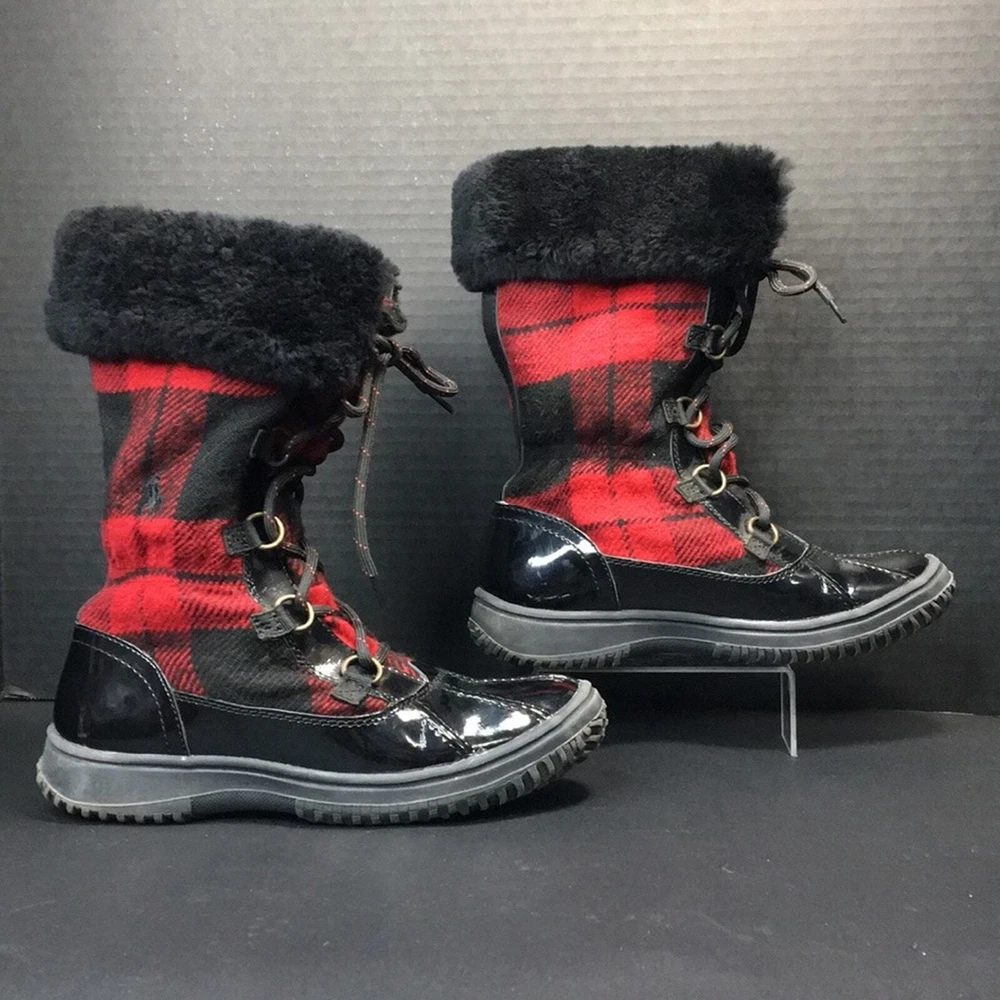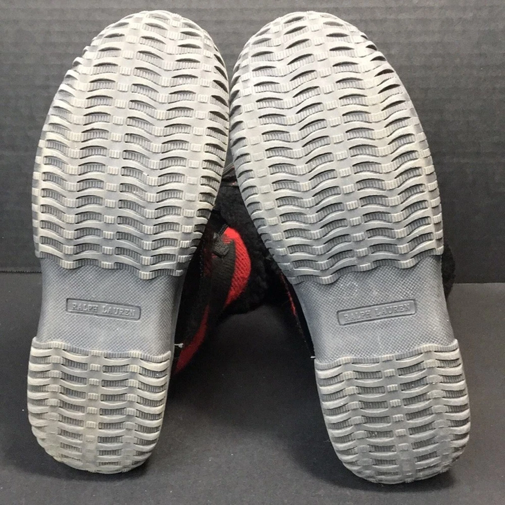 Polo by Ralph Lauren Big Kid Everest Boots Black Leather w/ Shearling Size 4. Black patent leather with red and black buffalo plaid flannel. Black top cuff is shearling. Inside lining is faux shearling. Boot shafts are floppy and are stuffed with paper to make them stand for pics. Preowned excellent condition with a few light scuffs and slight creasing on the leather. From a non-smoking home Bid Kid Size 4 Black leather with red and black buffalo plaid No box