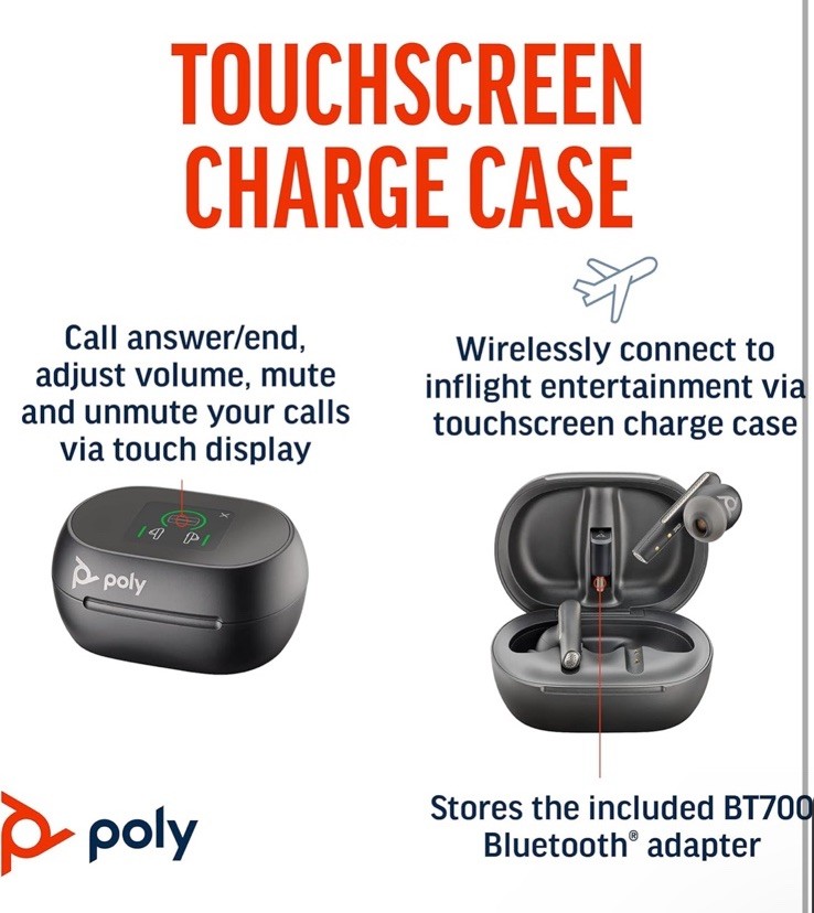 MIC QUALITY: 6 microphones (3 per earbud) make you heard clearly above background noise. Enjoy clearer outside calls thanks to WindSmart technology that reduces wind noise. ADAPTIVE ANC: Stay focused by keeping out the distractions of the outside world with adaptive active noise canceling (ANC). Let in the outside world when you need to by using transparency mode or by removing one earbud – use one or both earbuds for calls. SMART CHARGE CASE: Get up to 15 hours talk time with the Qi wireless-charging-enabled case. 15-minute quick charge gives over 1 hour of talk time. Configure/control your earbuds and see charge status using the touch display. CONTROL: Control your music and calls from either earbud with gesture controls and a physical button on both earbuds for maximum convenience. Wirelessly connect to inflight entertainment systems via the smart charge case. QUALITY SOUND: Relax and immerse yourself in music, movies, mobile gaming, and more wherever you want with high-quality audio. And know your device is protected against splashes and dust with an IP54 rating. CONNECTIVITY: Connect up to two Bluetooth devices (PC, Mac, iPhone, Android) at any time with multipoint technology (remembers up to 8 Bluetooth devices). BT700 adapter enables better audio performance than connecting directly to PC/Mac via Bluetooth. COMPATIBILITY: Experience seamless collaboration with top platforms including Zoom, Microsoft Teams, and Google Meet.