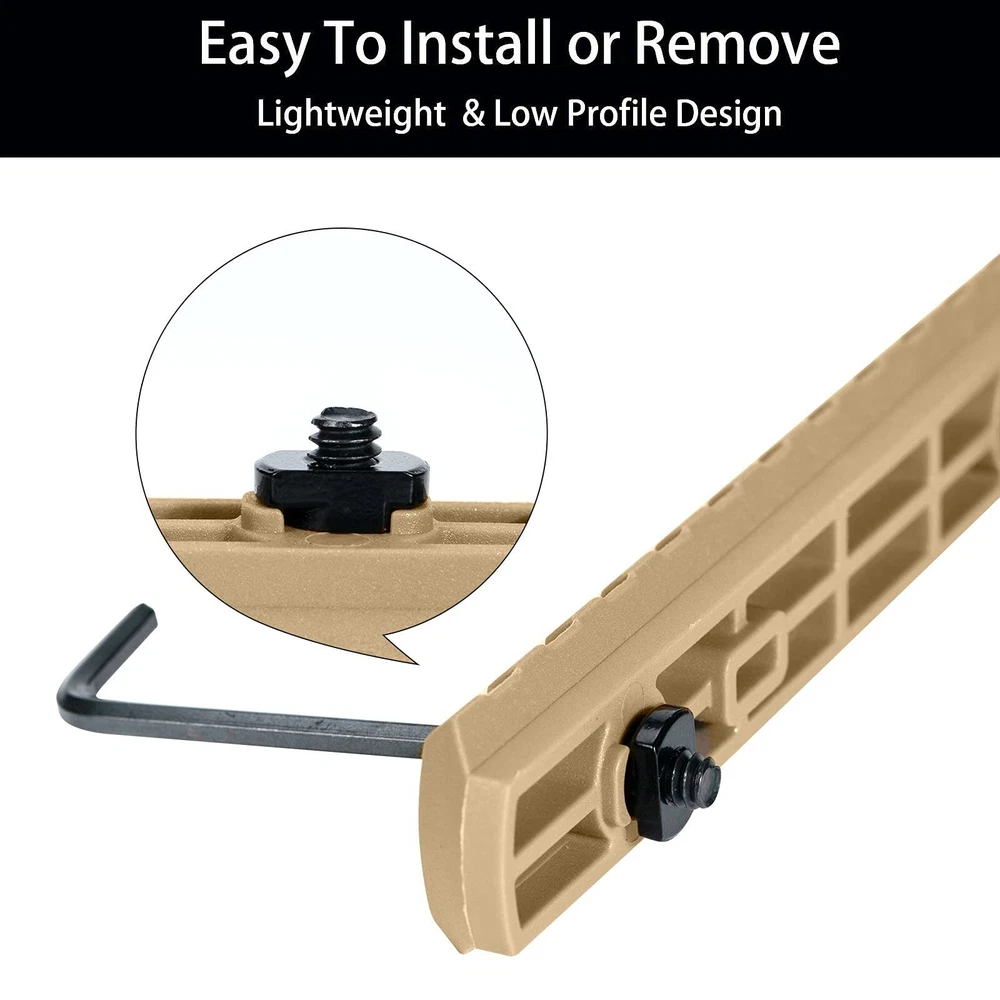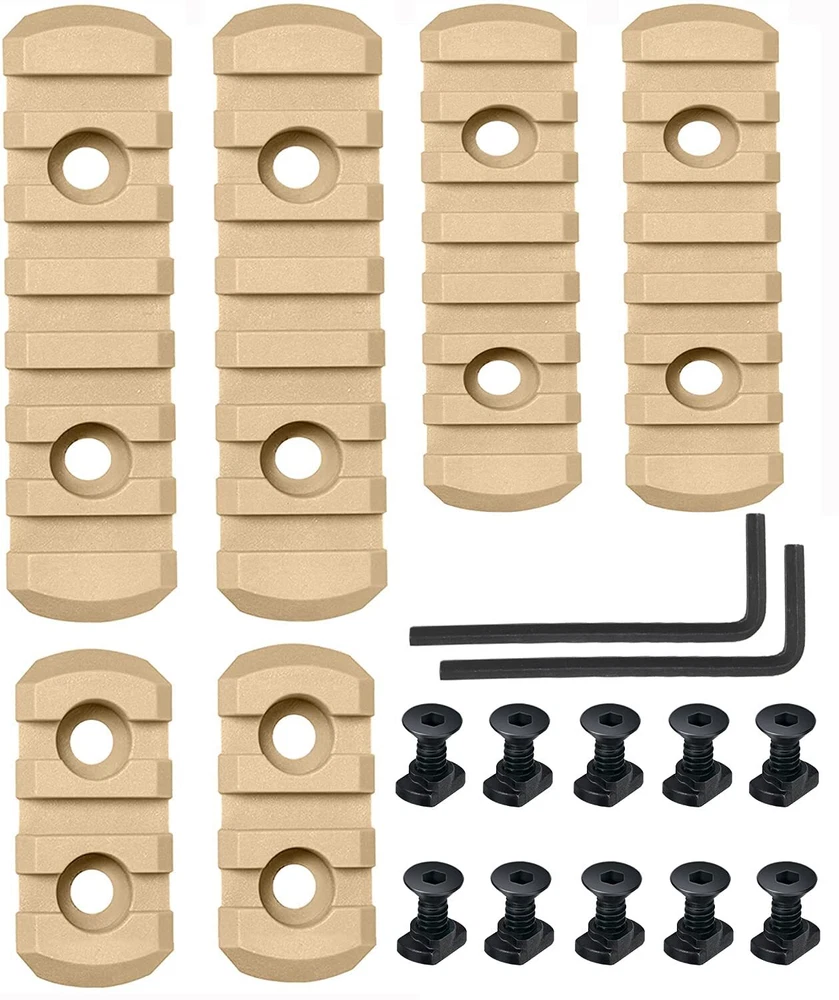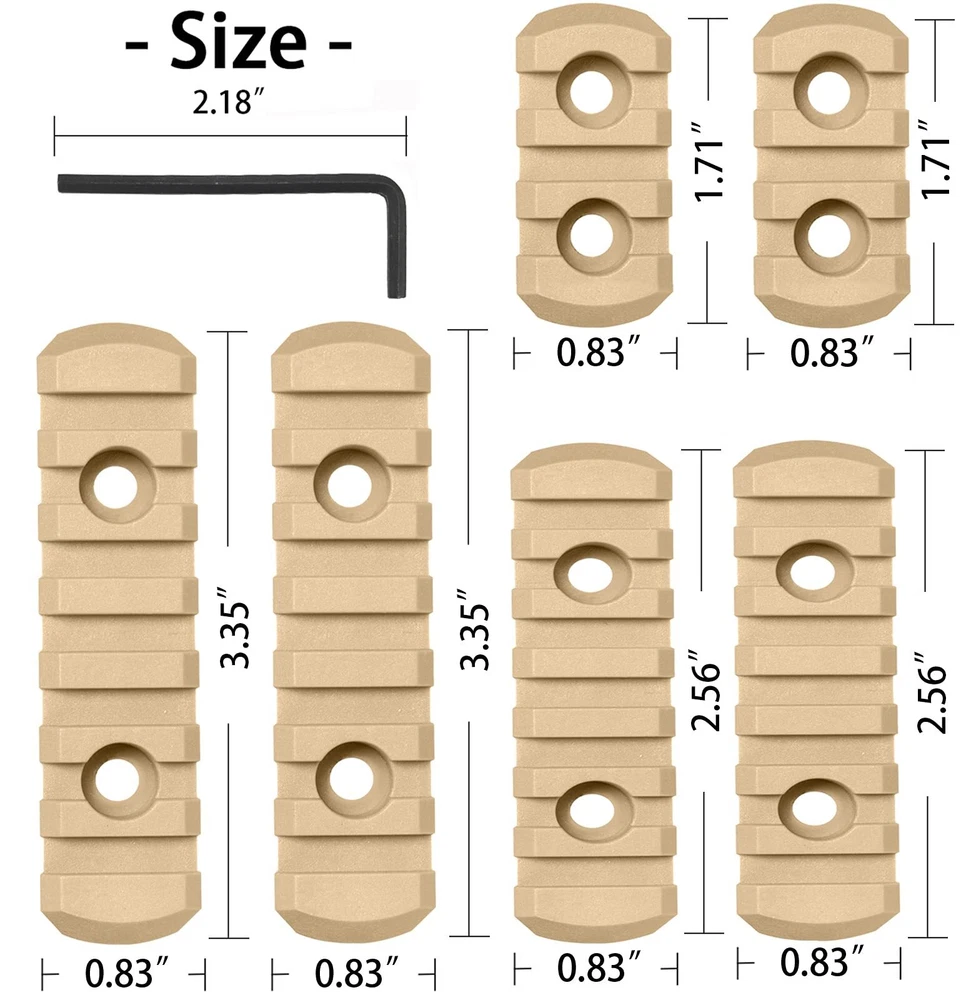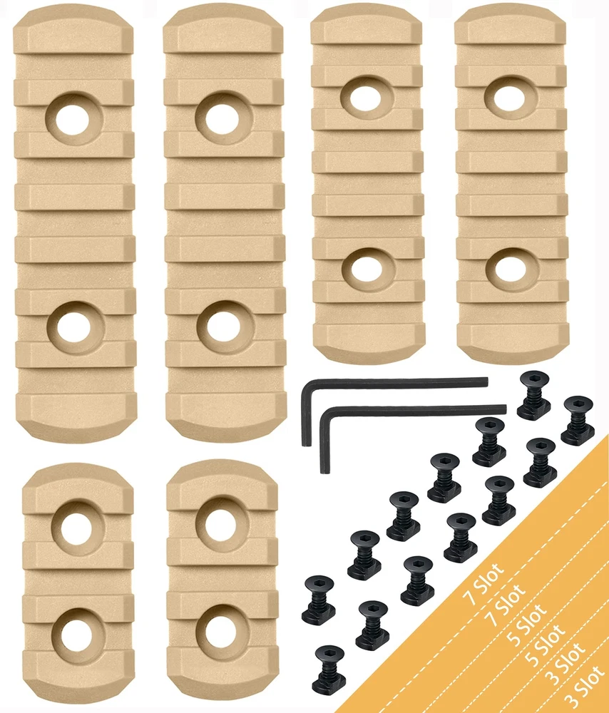 Packing list: nylon Single Picatinny Rails * 1 (6PCS), screws * 13 Product size 2*4.35cm 2*6.5cm 2*8.5cm Width 2.1cm Allow the attachment of all standard 21mm picatinny specrail-mounted accessories. Can position just enough rail area exactly where you need it for each accessory, available in three lengths Install These Screws by Allen Wrench Tool, Simple To Install or Remove. Pack Of 3-3-5-5-7-7 Slots , 13 Sets Matched Screws, 13 Sets Locking T-Nuts and 2Allen Wrench . Ultralight rail with solid polymer construction and low profile design reduces bulk. 7 Slots 0.36 Oz, 5 Slots 0.28 Oz, 3 Slots 0.19 Oz, much lighter than aluminum alloy, high strength and good safety Injection molded from a proprietary reinforced composite for enhanced strength and durability while remaining lightweight.