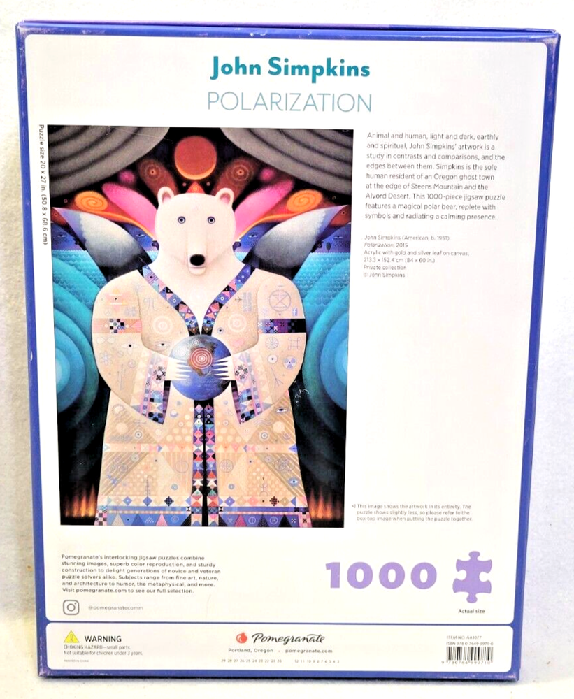 This wonderful 1000-piece puzzle features the breathtaking artwork of John Simpkins, depicting a beautiful polar bear in vibrant multi-color tones. The puzzle is made of high-quality cardboard material with interlocking pieces, ensuring a seamless and satisfying puzzle experience. Recommended for ages 8 and up, this puzzle is perfect for puzzle enthusiasts and collectors alike. The puzzle is complete, coming from a smoke-free household, and measures 20" x 27". Made in China, this puzzle is sure to provide hours of entertainment and relaxation. Doing puzzles has some hidden benefits . Excellent qualities : Cultivate concentration, patience, and temper your will Movement development : Train hand-eye coordination and precise small movements Spatial intelligence : Improve visual discrimination of colors and shapes Critical thinking ability : Understand the relationship between parts and the whole, and draw inferences from one example to explore the future Relaxes your mind : Relieve work pressure and release yourself Brain development : Enhance memory and may help prevent or slow brain degeneration * We did not work the puzzle or count the pieces, but we verify the number count at your request. Each item we ship is carefully packaged to prevent any damage and is shipped immediately with tracking.