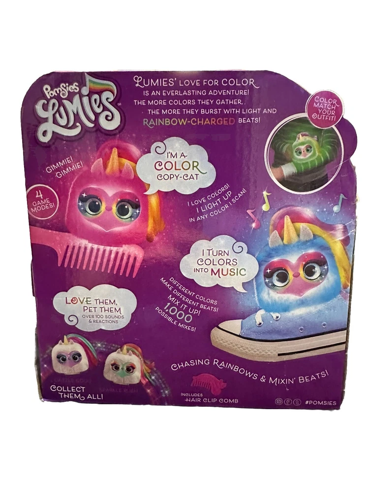 New - Introducing the Pomsies Lumies Electronic Interactive Pom-Pom Pet "Pixie Pop" in Color Copycat design. This Skyrocket brand stuffed toy is perfect for girls aged 3 and above. With battery-operated music and interactive features, this unicorn character toy is sure to bring fun and excitement to any child's playtime. The Pomsies Lumies product line is known for its high-quality and cuddly stuffed toys, and this Pixie Pop pom-pom pet is no exception. With its color-changing feature and unique design, it is a great addition to any toy collection. Get your hands on this fun and interactive toy today!