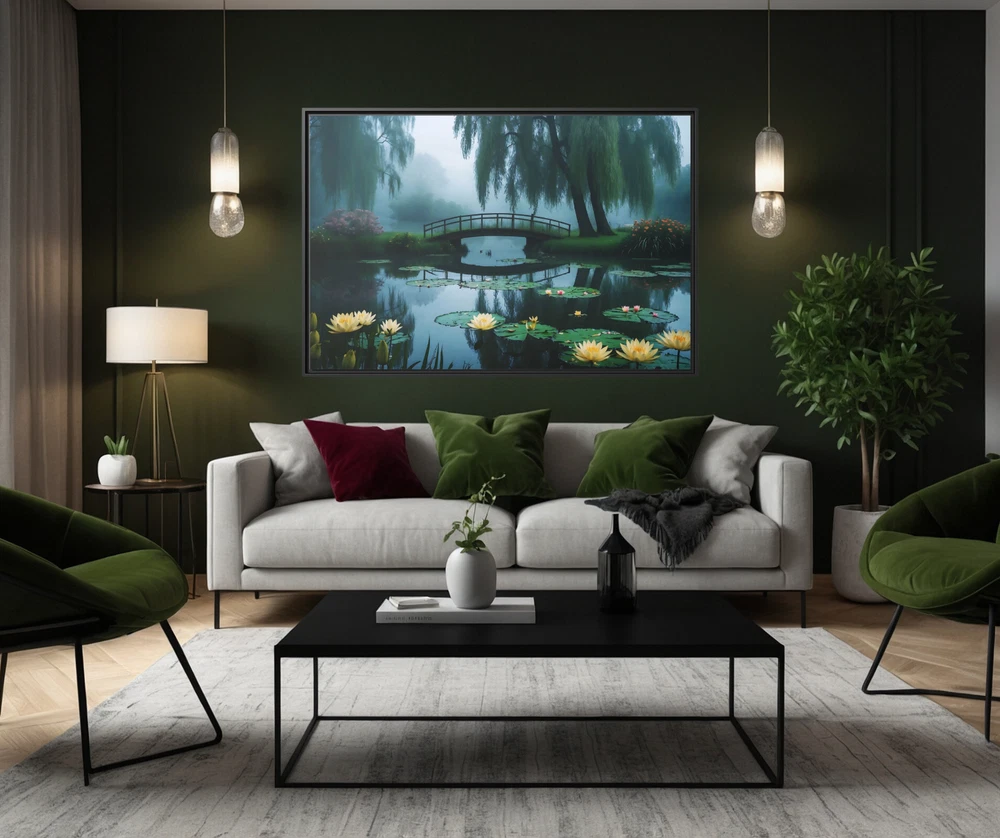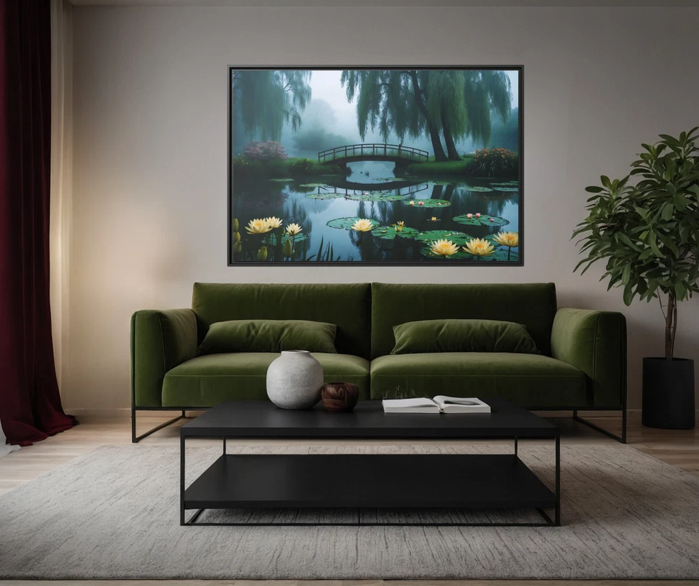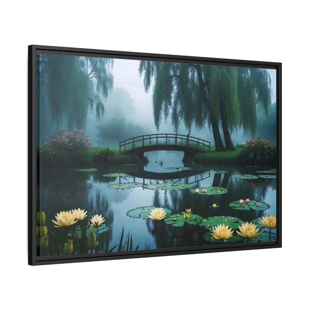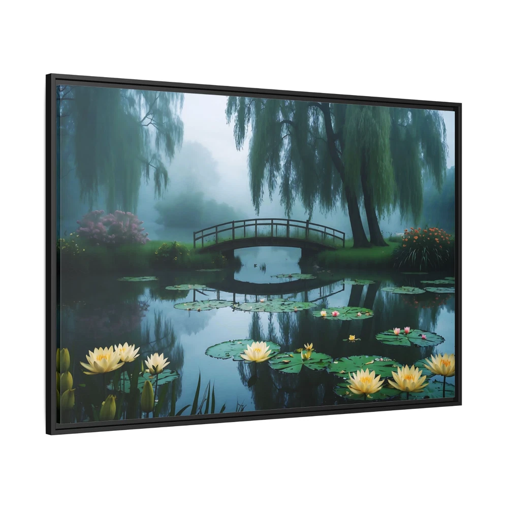 Tranquil Green Oasis: Framed HDR Landscape Canvas Product Description: Transform your space with " Tranquil Green Oasis " a serene green-dominant landscape illustration by Hypnotik Creations. Featuring a tranquil pond surrounded by lush grassy fields, vibrant wildflowers, and majestic weeping willow trees, this moody nature scene captures the essence of peace and harmony. A charming wooden bridge and floating water lilies add a touch of rustic elegance, making this artwork a true escape into the wonders of nature. Expertly printed in HDR on museum-quality cotton-polyester composite canvas, this piece showcases vibrant colors and intricate details enhanced by a proprietary matte finish coating that ensures long-lasting brilliance. Using UL-certified Greenguard Gold latex inks that are non-hazardous, non-toxic, and non-flammable, this artwork is as eco-conscious as it is stunning. The canvas is framed with a 1.25" solid pine wood floating frame available in a sleek black finish. Sustainably sourced and Forest Stewardship Council certified, the frame adds a modern aesthetic while supporting environmentally friendly practices. Ready to hang straight out of the box with pre-attached sawtooth hardware, rubber dots at the base ensure the canvas stays securely in place on your wall. This timeless piece of art is perfect for adding a touch of natural beauty to your living room, bedroom, or office. Please note that slight size variations (tolerance +/- 1/8") may occur due to the production process. Dust and maintain effortlessly with a gentle wipe using a clean, damp cloth. Key Features: Nature-Inspired Design: Features a serene pond surrounded by weeping willows, wildflowers, a wooden bridge, and floating lilies, creating a calming and moody atmosphere. HDR Printing Excellence: Printed on museum-quality cotton-polyester composite canvas with vivid colors and intricate detail, enhanced by a proprietary matte finish coating for durability and brilliance. Eco-Friendly Inks: Produced using UL-certified Greenguard Gold latex inks that are non-toxic, non-hazardous, and non-flammable, ensuring vibrant, safe, and eco-conscious artwork. Sustainably Sourced Frame: 1.25" solid pine wood floating frame available in black, certified by the Forest Stewardship Council for eco-friendliness. Ready to Hang: Equipped with sawtooth hanging hardware for easy installation and rubber dots for stability on your wall. Low Maintenance: Dust-resistant and easy to clean with a gentle wipe using a damp cloth. Slight Size Variations: Due to the handmade production process, size tolerance is +/- 1/8" (3.2 mm). Size Options: 30x20, 36x24 & 48x32. Enhance your interior with this breathtaking " Tranquil Green Oasis " canvas, a timeless celebration of nature that brings tranquility and charm to any space. * Shipping to Alaska, Hawaii, and unincorporated territories of the United States can take additional 7 ? 12 business days, weather permitting.