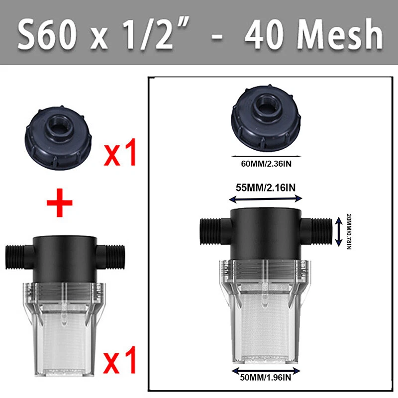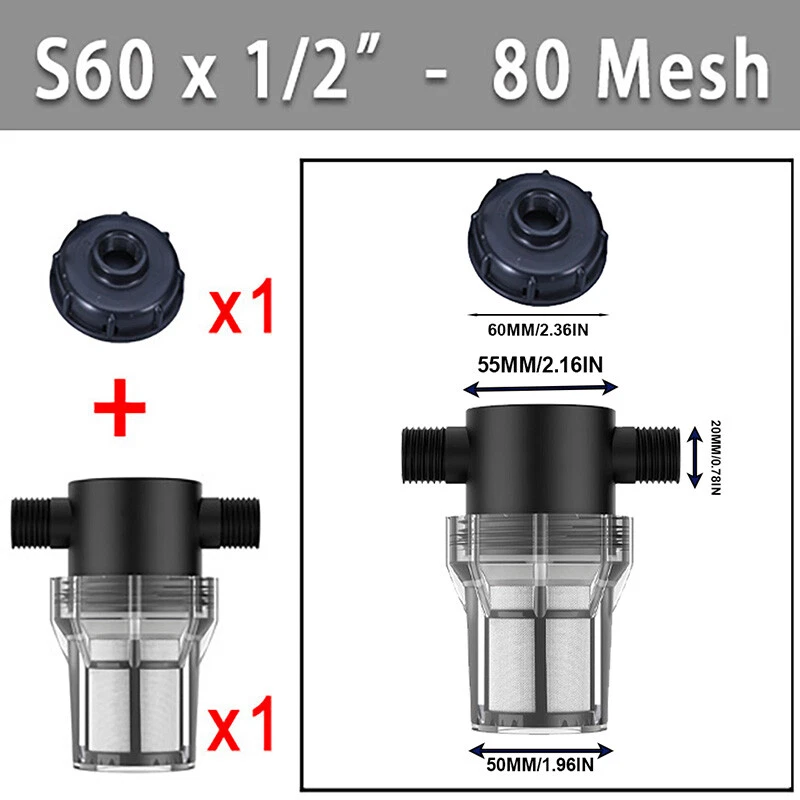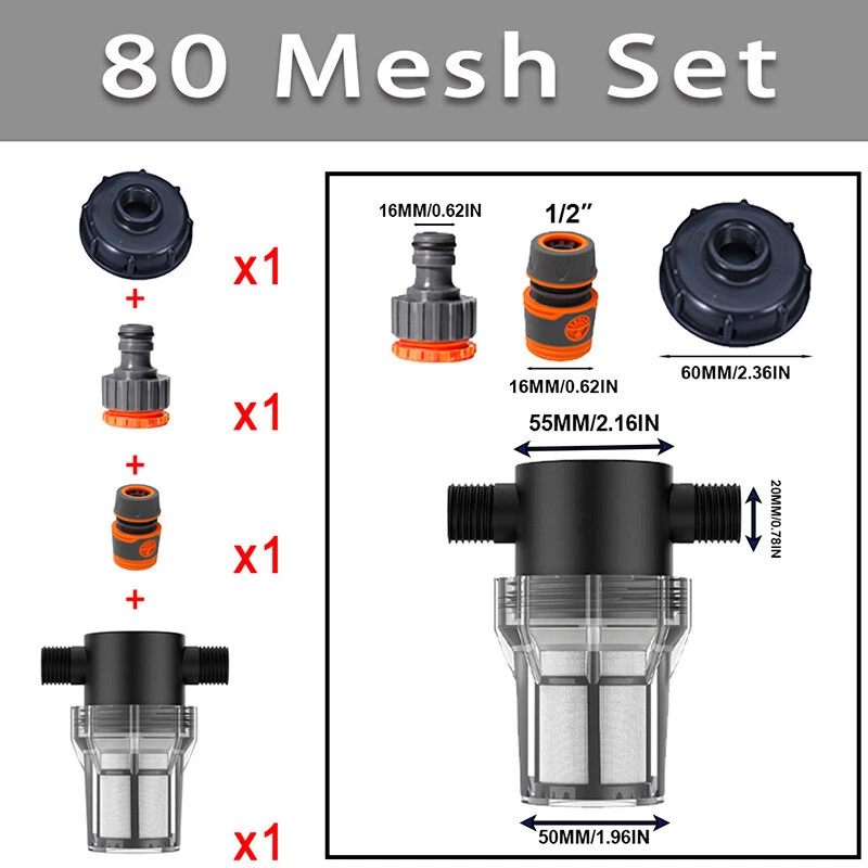 Description: Name: Water Pipe Filter Set Material: PC Color: Black+Transparent Threaded Interface: External Thread Interface Size: 4 Point Interface (1/2 inch) Filter Mesh: 40 Mesh, 80 Mesh Type: Set A, Set B, Set C, Set D, Set E, Set F, Set G, Set H Uses: Suitable for garden irrigation, car washing, fish tanks, water tanks, etc. Features: The size of the 40 mesh and 80 mesh filters is moderate, and the flow rate will not be affected when filtering impurities. In winter or in the sun for a long time, please put a protective cover on the surface of the filter to prevent the shell from bursting. The garden hose filter is small in size, easy to clean and reuse, no need to replace it for a long time. This filter is available in several different sizes: 1/2 in The filter is suitable for garden hoses, pressure washers and RVs, which can effectively filter out impurities and increase the life of water equipment. Package Includes: Set A: 1 Pcs 1/2 Inch Port 40 Mesh Filter, 1 Pcs 1/2 Inch IBC Bucket Adapter Set B: 1 Pcs 1/2 Inch Port 80 Mesh Filter, 1 Pcs 1/2 Inch IBC Bucket Adapter Set C: 1 Pcs 1/2 Inch Port 40 Mesh Filter, 1 Pcs 1/2 Inch IBC Bucket Adapter, 1 Pcs 1/2 Inch Garden Hose Quick Plug Connector, 1 Pcs Faucet Quick Connect Nipple Connector (1 /2 Inch Connector And 3/4 Inch Connector) Set D: 1 Pcs 1/2 Inch Port 80 Mesh Filter, 1 Pcs 1/2 Inch Ibc Bucket Adapter, 1 Pcs 1/2 Inch Garden Hose Quick Plug Connector, 1 Pcs Faucet Quick Connect Nipple Connector (1 /2 Inch Connector And 3/4 Inch Connector) Set E: 1 Pcs 1/2 Inch Port 40 Mesh Filter, 2 Pcs Faucet Quick Connect Nipple Connectors (1/2 Inch Port And 3/4 Inch Port) Set F: 1 Pcs 1/2 Inch Port 80 Mesh Filter, 2 Pcs Faucet Quick Connect Nipple Connectors (1/2 Inch Port And 3/4 Inch Port) Set G: 1 Pcs 1/2 Inch Port 40 Mesh Filterr, 2 Pcs 1/2 Inch Garden Hose Plug In Connector, 2 Pcs Faucet Quick Connect Nipple Connector (1/2 Inch Port And 3/4 Inch Port) Set H: 1 Pcs 1/2 Inch Port 80 Mesh Filter, 2 Pcs 1/2 Inch Garden Hose Quick Connect Connector, 2 Pcs Faucet Quick Connect Nipple Connector (1/2 Inch Port And 3/4 Inch Port) Notice: 1. Transition: 1cm=10mm=0.39inch 2. Please allow 0-3cm error due to manual measurement. Please make sure you do not mind before bidding. 3. Due to the difference between different monitors, the picture may not reflect the actual color of the item. Thanks! On Dec 18, 2024 at 17:11:38 PST, seller added the following information: