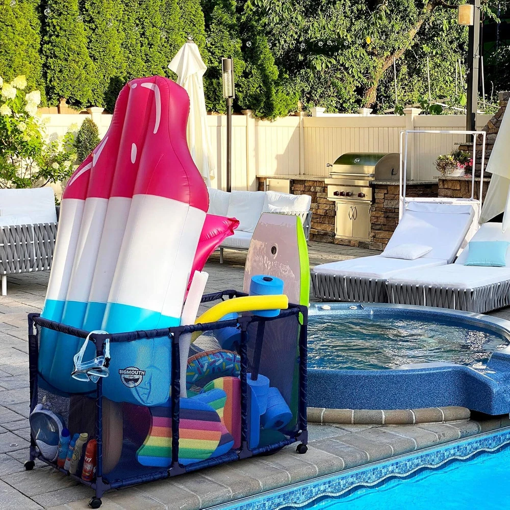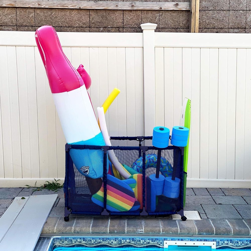 Essentially Yours Pool Noodles Holder, Toys, Floats, Balls and Floats Equipment Mesh Rolling Storage Organizer Bin, Kids Height, Large, (43" W x 25" L x 28" H), Blue Style 563009 Item Description About this item Made of a weather resistant PVC along with a high quality and durable, weather and tear resistant mesh, Essentially Yours provide a long-lasting solution for your pool storage needs Low Height allows kids to easily reach in to remove and place pool items while the extended width provides an amply large mesh area. Side pockets provided for additional storage of small items. Store toys, inflatables, floats, noodles, balls, goggles, pool cleaning tools, and more. Wheels are lockable on one side to allow for securing the bin in a stationary position or rolling as needed. Assembled Size: 25" L x 43" W x 28" H. Cubic Feet (Mesh Area): 15.5 Choose from our wide variety of sizes and blue, white, or brown color options Tool Free Assembly with our easy-to-follow instructions. › See more product details Mesh pockets make it easy to retrieve small pool toys, balls, and pool safety equipment. The large compartment allows you to store and organize your larger pool items. With included castor wheels, moving and positioning the pool organizer to your desired position is a breeze. Each organizer is perfect for keeping yard equipment, toys, chairs, and other garden accessories organized and tidy! You WON'T need a single tool to assemble this product! All orders arrive with instructions and all pieces are categorized by a letter. It's a quick and simple installation process. Payment We accept payment only through PAYPAL Shipping We ship products worldwide through standard express courier service, it will reach within 7 to 10 days to abroad buyers, we ship the product after recieved clear payment and give full information about shipment to the buyer Return We accept product return within 7 to 21 days from delivery date but product should be in original position and not in damaged condition,the return shipping charges will be buyer responsibility