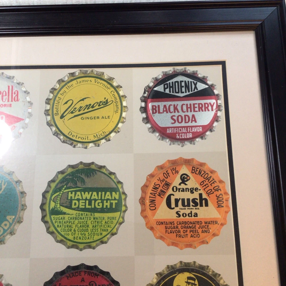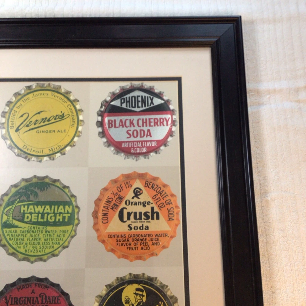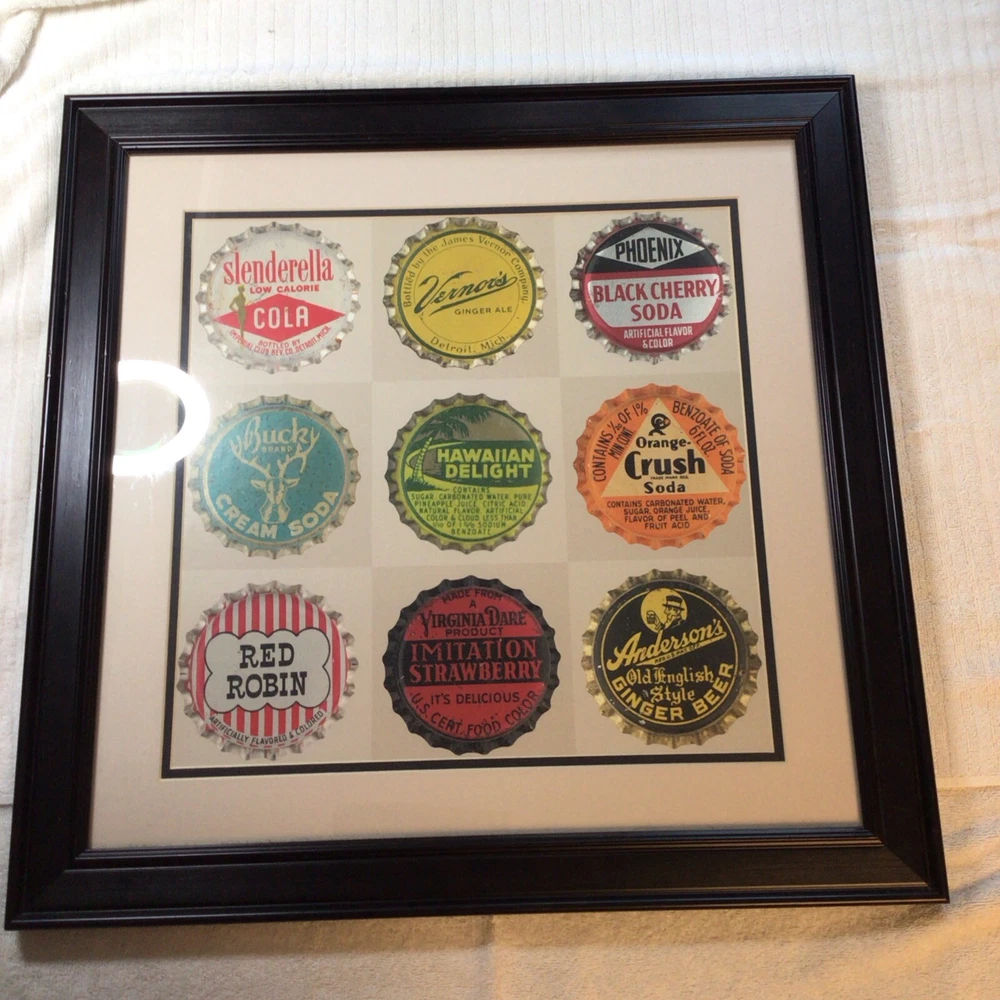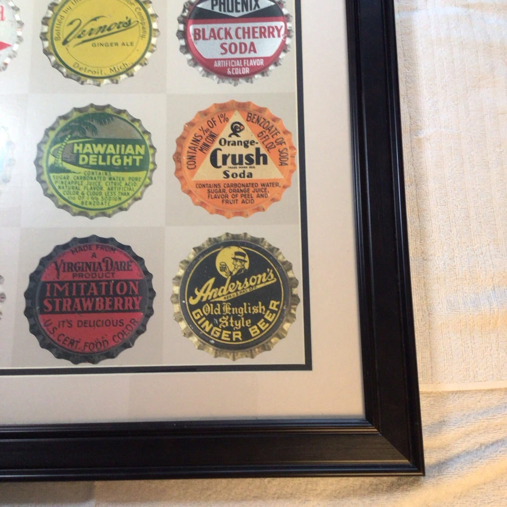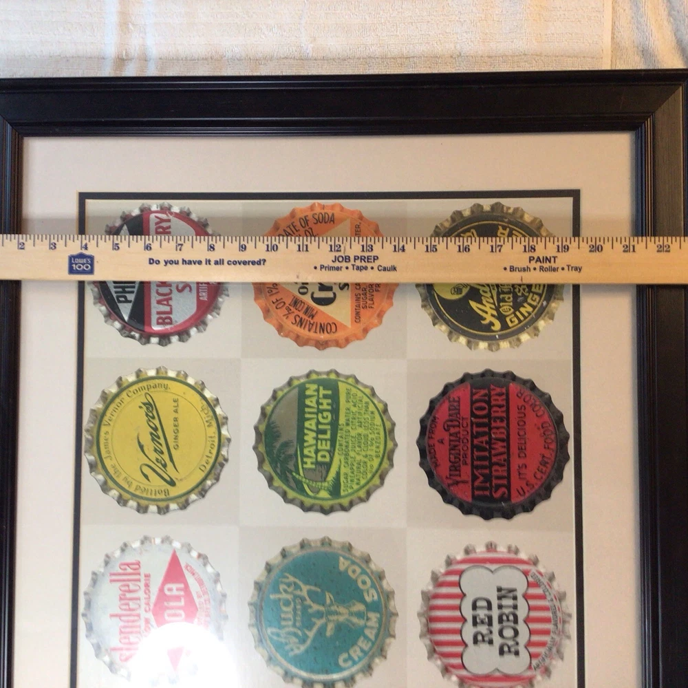 This beautiful giclee print titled "Pop Bottle Tops II" is a stunning piece of art that captures the essence of American culture. The artwork features a colorful depiction of soda bottle caps, which adds a touch of nostalgia to any room. The print is matted and framed, making it ready to display upon arrival. The piece measures 23 inches in both height and length, and is made of high-quality paper. The artwork is perfect for those who love art deco style, Americana, and pop culture. Don't miss your chance to own this unique and captivating piece of art. Nice piece with dark frame. The back has some stains and blemishes but doesn’t affect the print or frame. Please look at the pictures closely, as this is the item that you will receive.