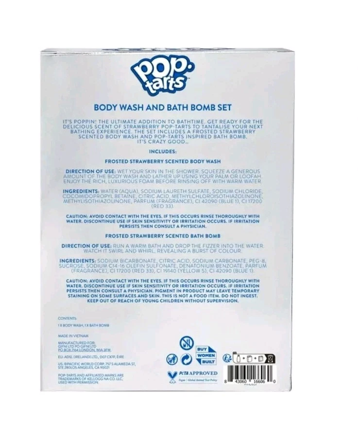Formulation: Liquid Color: Multicolor Skin Type: Normal Skin Scent: Strawberry Body Area: Body Brand: POP Tarts Type: Body Wash MPN: 5893208578 gtin13: 843060166060 Size: Regular Department: Men, Teens, Unisex, Women Volume: 16 fl oz Country/Region of Manufacture: Unknown UPC: 843060166060