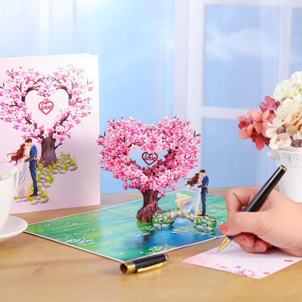 Pop Up Anniversary Cards, 3D Heart Cherry 6 x 8 inches, Pink Product Details Elegant Design: Featuring a stunning heart-shaped peach blossom tree, this beautifully crafted pop-up card symbolizes enduring love and harmony. At its center, a bold red heart with the word "Love" in elegant typography adds a meaningful and romantic touch. A Heartfelt Surprise: Beneath the tree, a loving couple is depicted embracing on a charming bridge, creating a picturesque and emotional scene that celebrates love. This card doubles as a keepsake display, reminding the recipient of your thoughtful gesture. Perfect for Loved Ones: An ideal choice for husbands, wives, couples, boyfriends, and girlfriends, this card is perfect for expressing your love on special occasions such as Valentine’s Day, weddings, anniversaries, or couple’s birthdays. Personalized Touch: Includes a slide-out note for you to pen heartfelt messages, allowing you to add a warm, personal touch to your gift. This feature ensures your love and care are expressed in a truly unique way. Love Card with Envelope and Note: Package Contents 1 Pop-up Card(6x8 inches) +1 Envelope +1 Note tag. This 3D pop-up greeting card is the perfect choice if you want a unique and memorable gift.