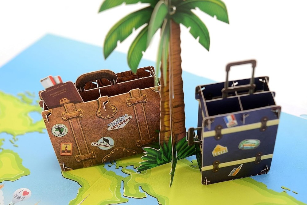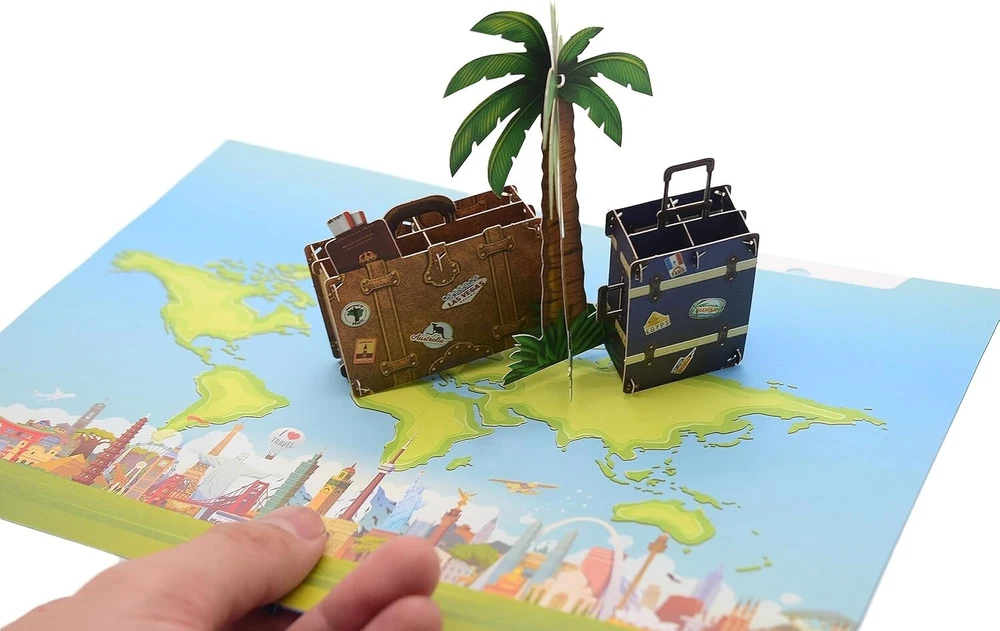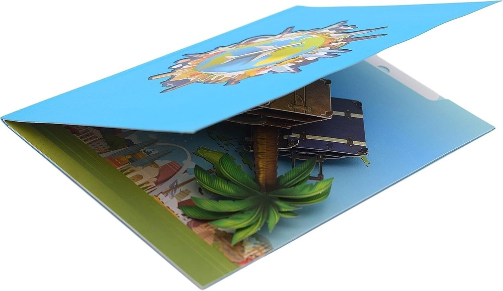 The Perfect Travel Gift : Looking for a unique and unforgettable gift for someone traveling abroad? Our 3D Pop-Up Travel Voucher card is perfect for any occasion, whether it’s a honeymoon, a wedding gift, or simply a surprise for a globetrotter. It's the ultimate way to wish someone well on their journey. Magical 3D Design : When the card is opened, a beautiful scene unfolds featuring suitcases, a palm tree, and a world map. The vibrant colors and detailed design will amaze the recipient, creating an unforgettable moment. Personalize & Surprise : You can easily add a personal message to the included note card, making it perfect for a gift card or even cash. For added fun, slip money into the suitcase cut-out for an extra surprise, making the experience even more memorable. A Keepsake Card : This card is designed to be cherished long after the occasion. Measuring 12.7 x 17.8 cm, it comes with an envelope and a pull-out message card. It’s a keepsake that will be displayed and appreciated for years to come. Designed to Impress : Handcrafted with intricate detail and premium materials, this travel voucher card is more than just a card—it’s a piece of art. Perfect for any occasion, it’s a meaningful gift that will truly stand out.